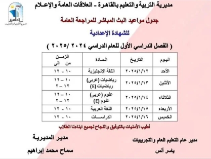 أعلنت سماح إبراهيم مديرية التربية والتعليم بالقاهرة، انطلاق البث المباشر لمراجعة المواد الدراسية للشهادة الإعدادية للفصل الدراسي الأول لعام ٢٠٢٥/٢٠٢٤، وذلك تحت إشراف مدير التعليم العام والتجريبيات.
