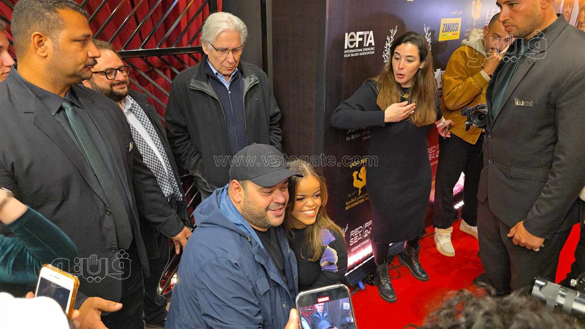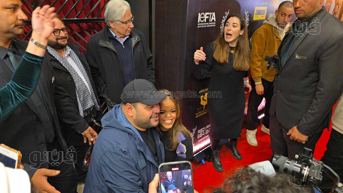 وخطفت بطلة الفيلم مريم شريف الأنظار عقب وصولها إلى السجادة الحمراء، وحرص محمد جمعة علي تقبيلها ودعمها.