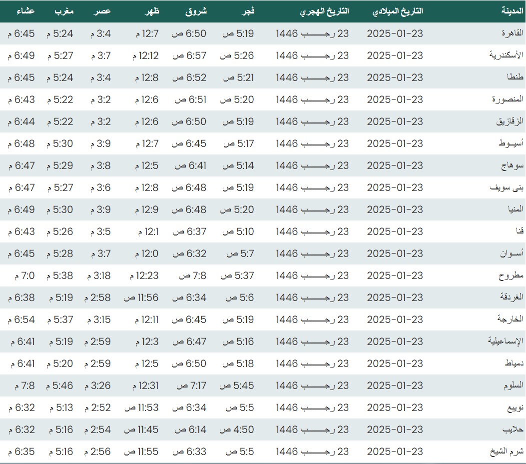 مواقيت الصلاة اليوم الخميس 23 - 1- 2025 في القاهرة والمحافظات