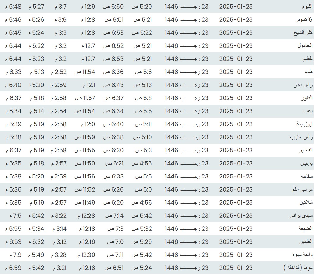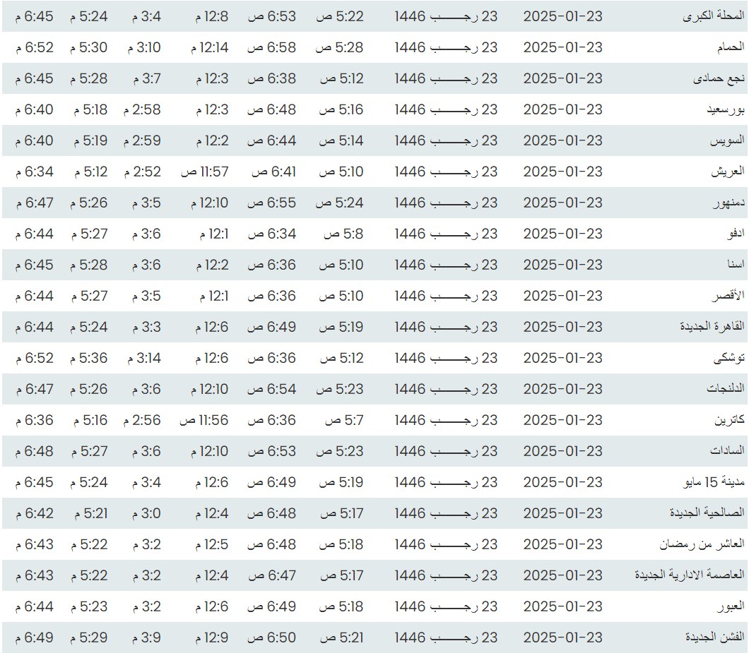 مواقيت الصلاة اليوم وفقًا للتوقيت المحلي لمدينتي القاهرة والإسكندرية وكذلك، مواقيت الصلاة، لعدد من مدن ومحافظات الجمهورية من واقع بيانات الهيئة العامة للمساحة