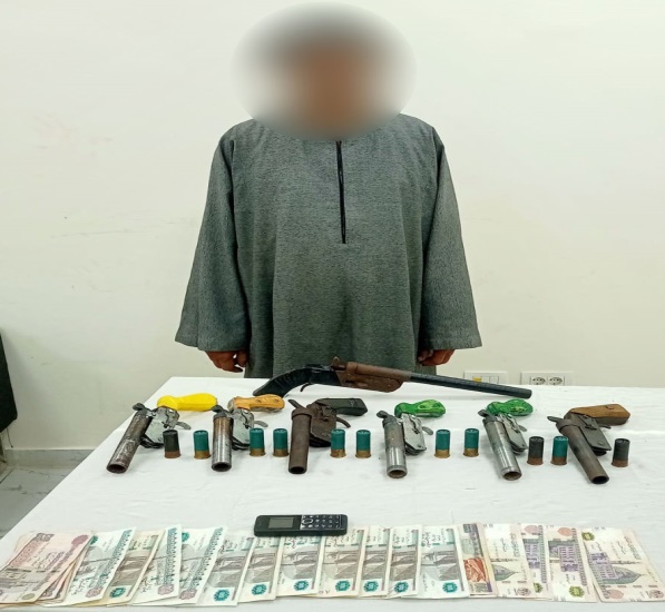 وعقب تقنين الإجراءات تم استهدافه وضبط وعثر بحوزته على (6 فرد خرطوش - بندقية خرطوش– عدد من الطلقات) وبمواجهته إعترف بحيازته للمضبوطات بقصد الإتجار، وتم اتخاذ الإجراءات القانونية وجاري العرض على النيابة العامة.