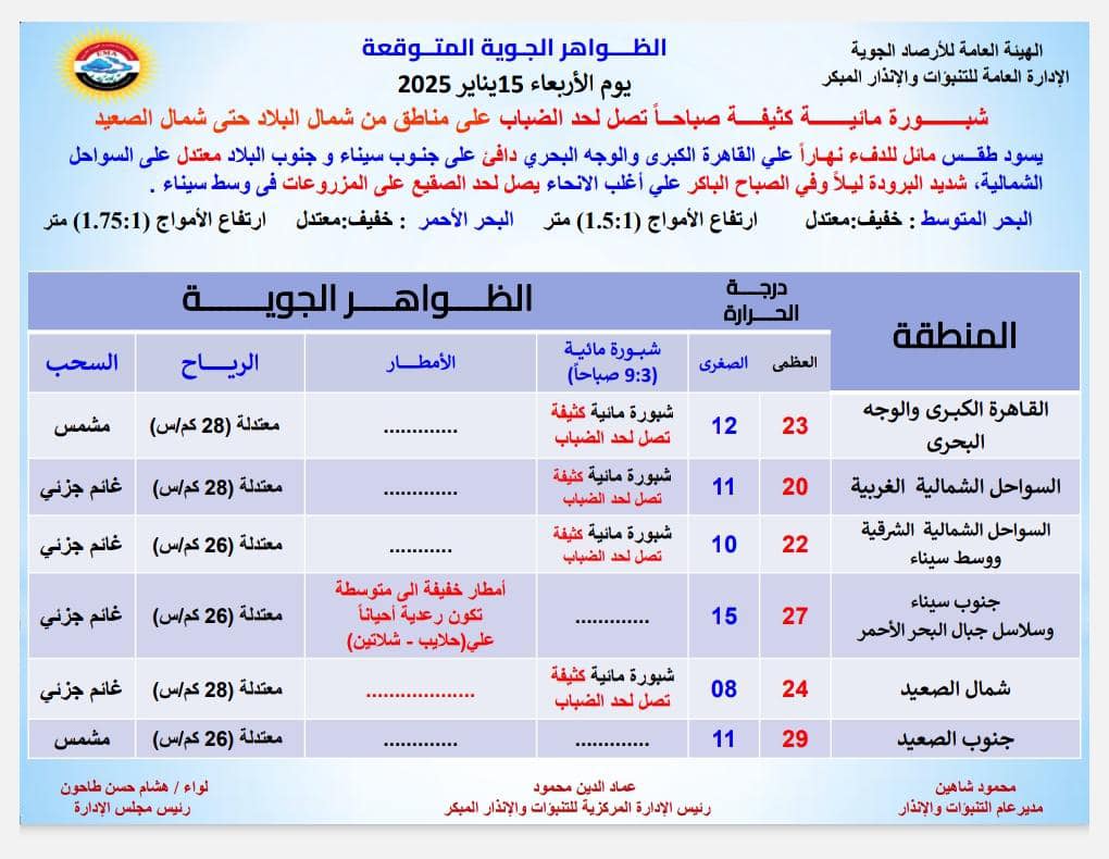 وأشارت إلى أن المناطق المعرضة للشبورة الكثيفة تصل لحد الضباب، هي القاهرة الكبرى والوجه البحري والسواحل الشمالية الغربية والشرقية ووسط سيناء وشمال الصعيد.