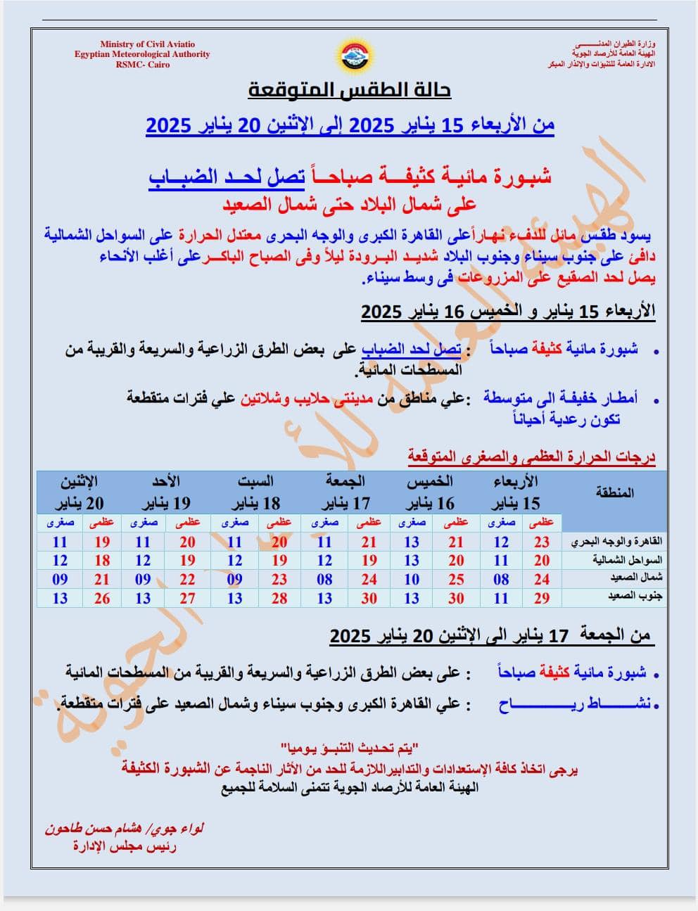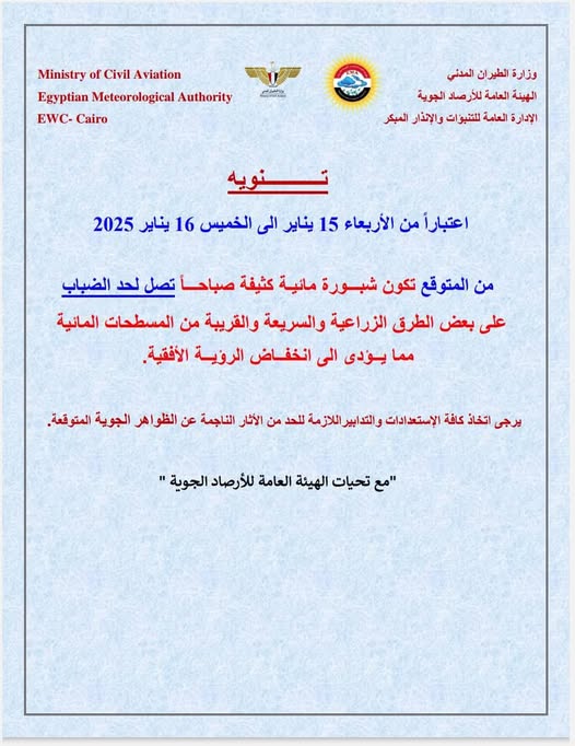 كما كشفت هيئة الأرصاد الجوية عن حالة الطقس الجمعة 17 يناير حتى الإثنين 20 يناير 2025، مؤكدة أن الطقس خلال هذه الفترة يشهد شبورة مائية كثيفة صباحا على بعض الطرق الزراعية والسريعة والقريبة من المسطحات المائية.