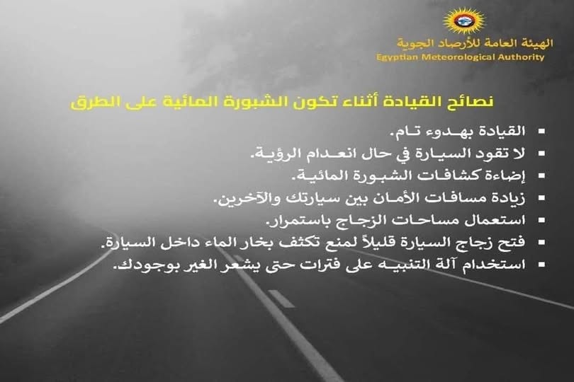 ووجهت هيئة الأرصاد الجوية العديد من النصائح لمواجهة الشبورة المائية: