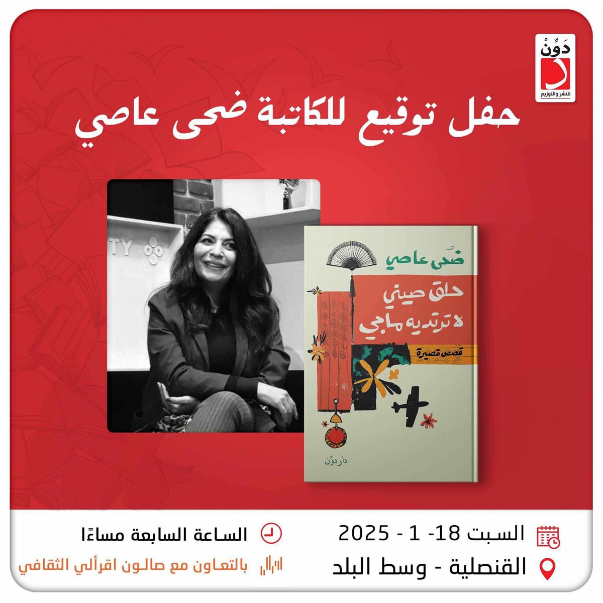 تطلق دار “دون” للنشر والتوزيع حفل توقيع لأحدث إصدارات الكاتبة ضحى عاصي، والمعنون بــ “حلق صيني لا ترتديه ماجي”، والتي تأتي فى قالب مجموعة قصصية.