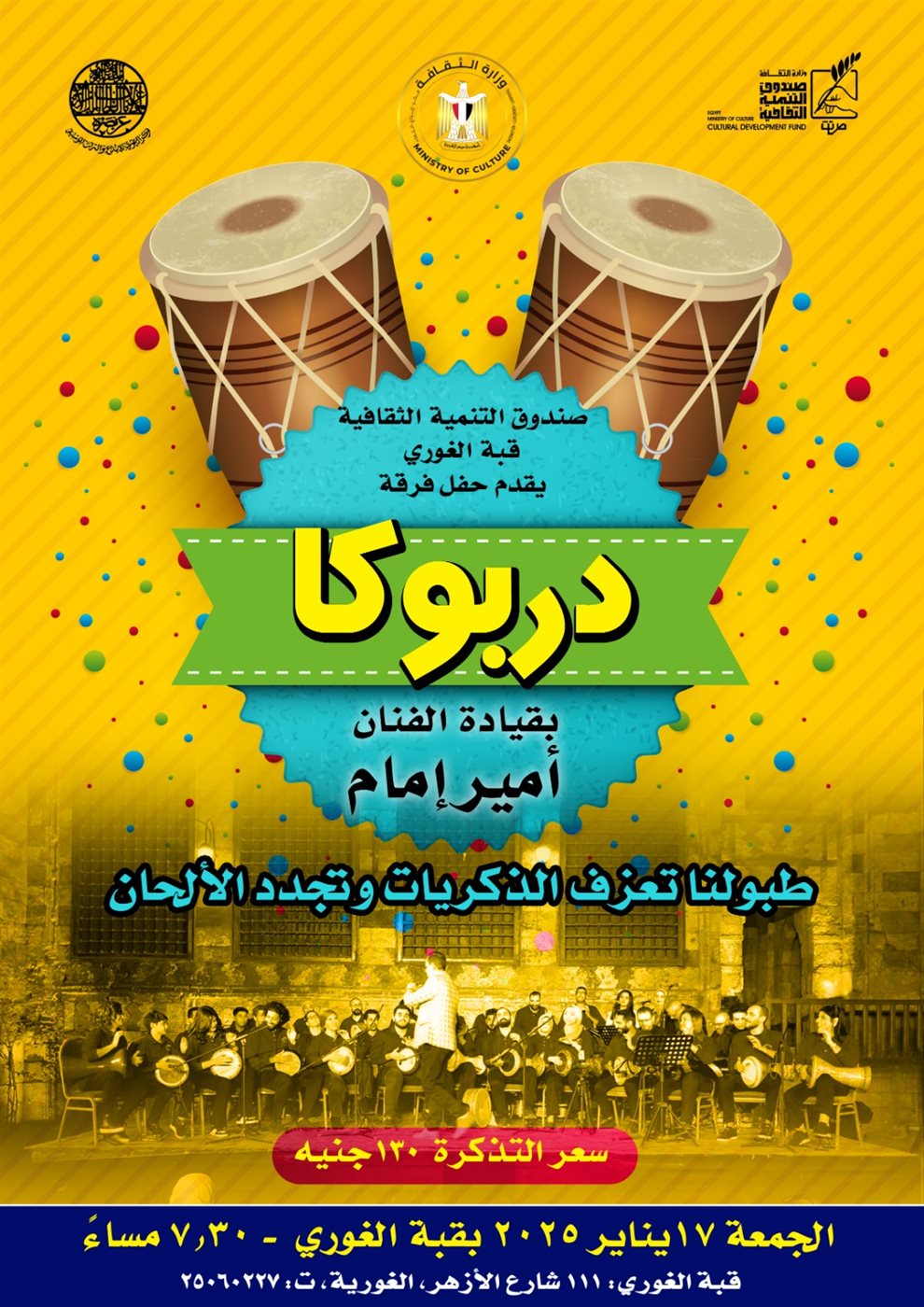 يستضيف مركز إبداع قبة الغوري بشارع الأزهر، التابع لقطاع صندوق التنمية الثقافية، حفلًا فنيًا تقدمه فرقة "دربوكا" بقيادة الفنان أمير إمام، وذلك في الثامنة مساء الجمعة الموافق 17 يناير.