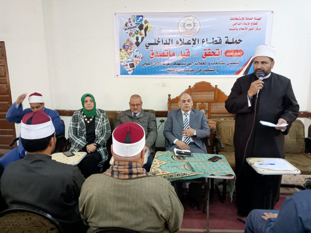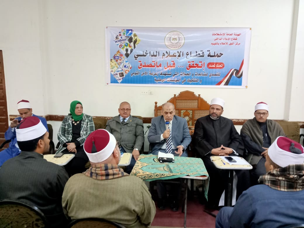 نظم مركز النيل للإعلام بمحافظة الفيوم، ندوة اليوم الأربعاء، بالتعاون مع مديرية أوقاف الفيوم تحت عنوان "الخطاب الديني وتعزيز الأمن الفكري " وذلك ضمن حملة " اتحقق قبل ما تصدق" والتي أطلقها قطاع الإعلام الداخلى، للتصدي للشائعات والحملات التي تستهدف زعزعة الأمن القومي وزعزعة الثقة في المؤسسات الوطنية والتشكيك في الإنجازات القومية والتي يتم تنفيذها من خلال مراكز النيل والإعلام على مستوى الجمهورية.