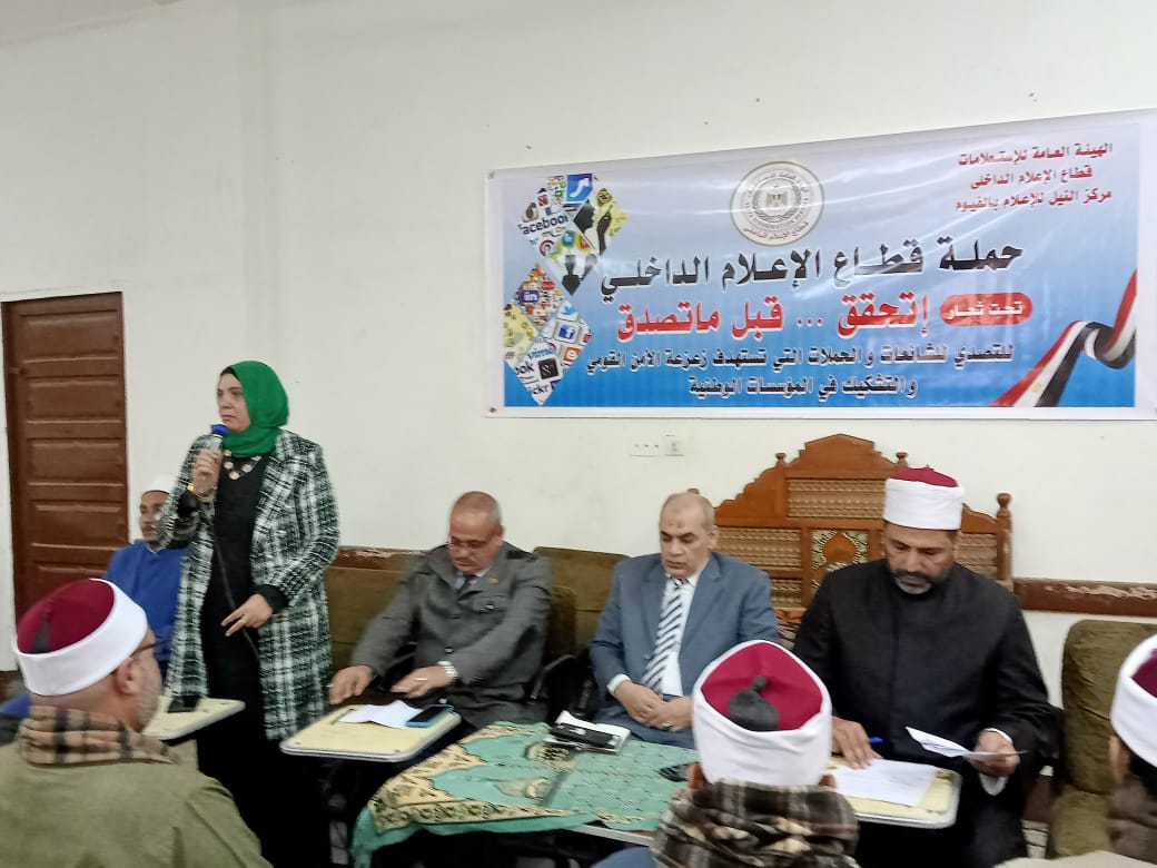 وأشارت إلى أن قطاع الإعلام الداخلي بالهيئة العامة للاستعلامات، له دور فعال في رفع الوعى والتثقيف لكافة شرائح المجتمع من خلال اللقاءات والندوات والحلقات النقاشية كأحد أهم الوسائل الاتصالية التي تقوم بها مراكز النيل والإعلام على مستوى الجمهورية، والمرحلة الراهنة التي تستوجب من الجميع التصدي لحروب الشائعات التي تنال من وحدة وتماسك المجتمع، وأثنت على على التعاون الفاعل بين مديرية أوقاف الفيوم ومركز النيل للإعلام في بناء الوعي لدى كافة شرائح المجتمع، مؤكدة على الدور المؤثر لأئمة وخطباء المساجد.