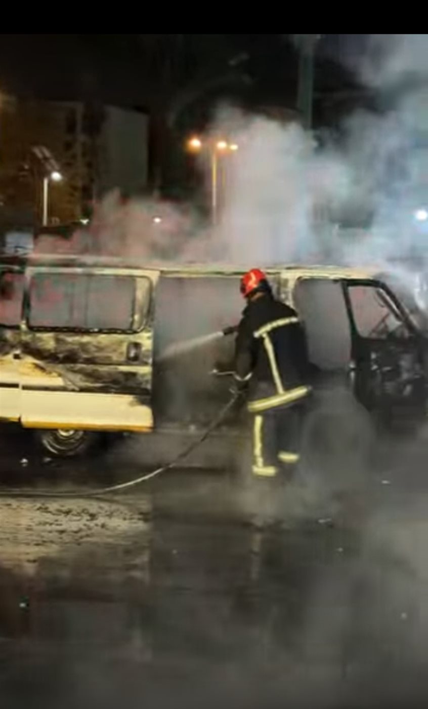 إخماد حريق اندلع في ميكروباص أمام محطة وقود بالعجمي (صور)