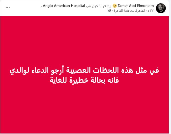 وقال الفنان تامر عبد المنعم على صفحته الشخصية بـ"فيس بوك": " في مثل هذه اللحظات العصيبة أرجو الدعاء لوالدي فإنه بحالة خطيرة للغاية".
