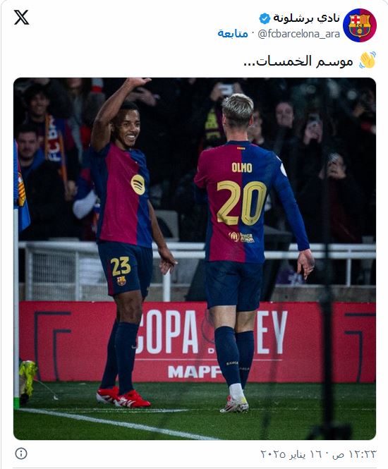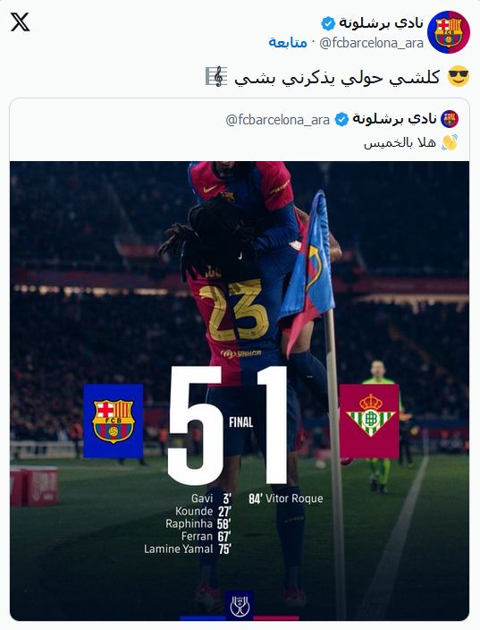 وعقب مباراة ريال بيتيس نشر الحساب الرسمي لبرشلونة تغريدة بمنصة إكس، ويظهر فيها كوندي ويرفع يده بالرقم (5) وكتب على الصورة "موسم الخمسات"، في إشارة إلى المباراة الماضية أمام ريال مدريد ومباراة بيتيس، والتي فاز بهما بخماسية.