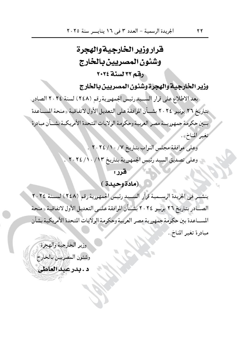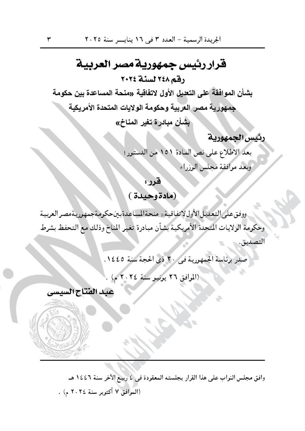 -القرار الجمهوري رقم 248 لسنة 2024، بشأن الموافقة على التعديل الأول لاتفاقية "منحة المساعدة بين حكومة جمهورية مصر العربية وحكومة الولايات المتحدة الأمريكية بشأن مبادرة تغير المناخ.