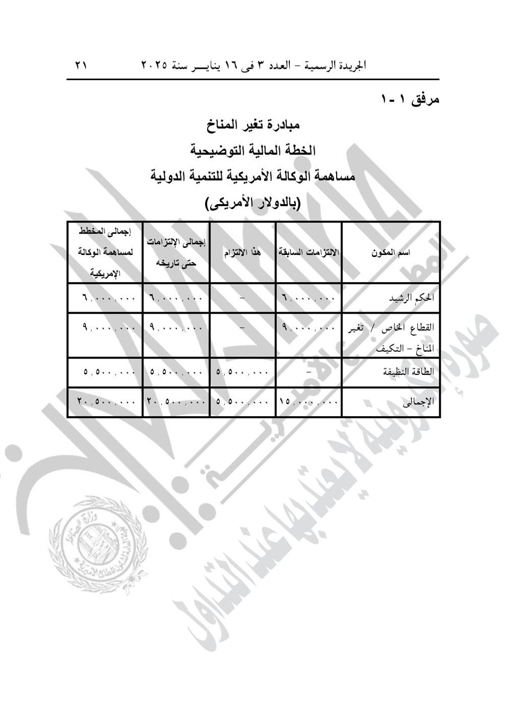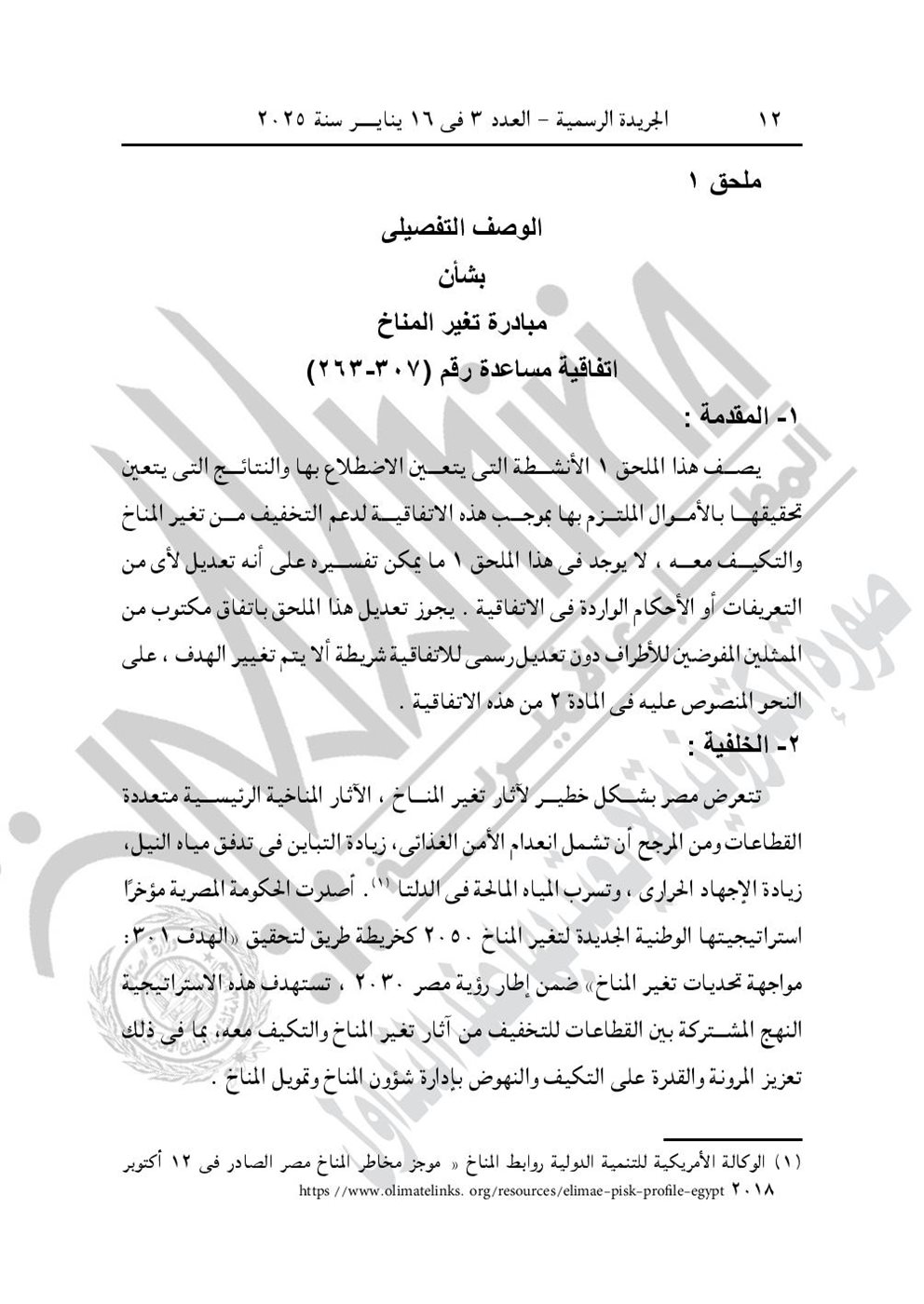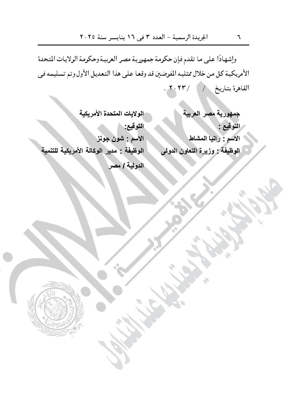 نشرت الجريدة الرسمية في عددها رقم 3، الصادر في 16 يناير 2025، 3 قرارات جمهورية جديدة اليوم للرئيس عبد الفتاح السيسي، بشأن الموافقة على التعديل الأول لاتفاقية "منحة المساعدة بين مصر وأمريكا بشأن مبادرة تغير المناخ، والموافقة على اتفاقية "إزالة الازدواج الضريبي" بين مصر وعمان، الموافقة على "التعديل الثانى لاتفاق منحة المساعدة الفنية لمشروع الخط الأول لمترو الأنفاق بالقاهرة.