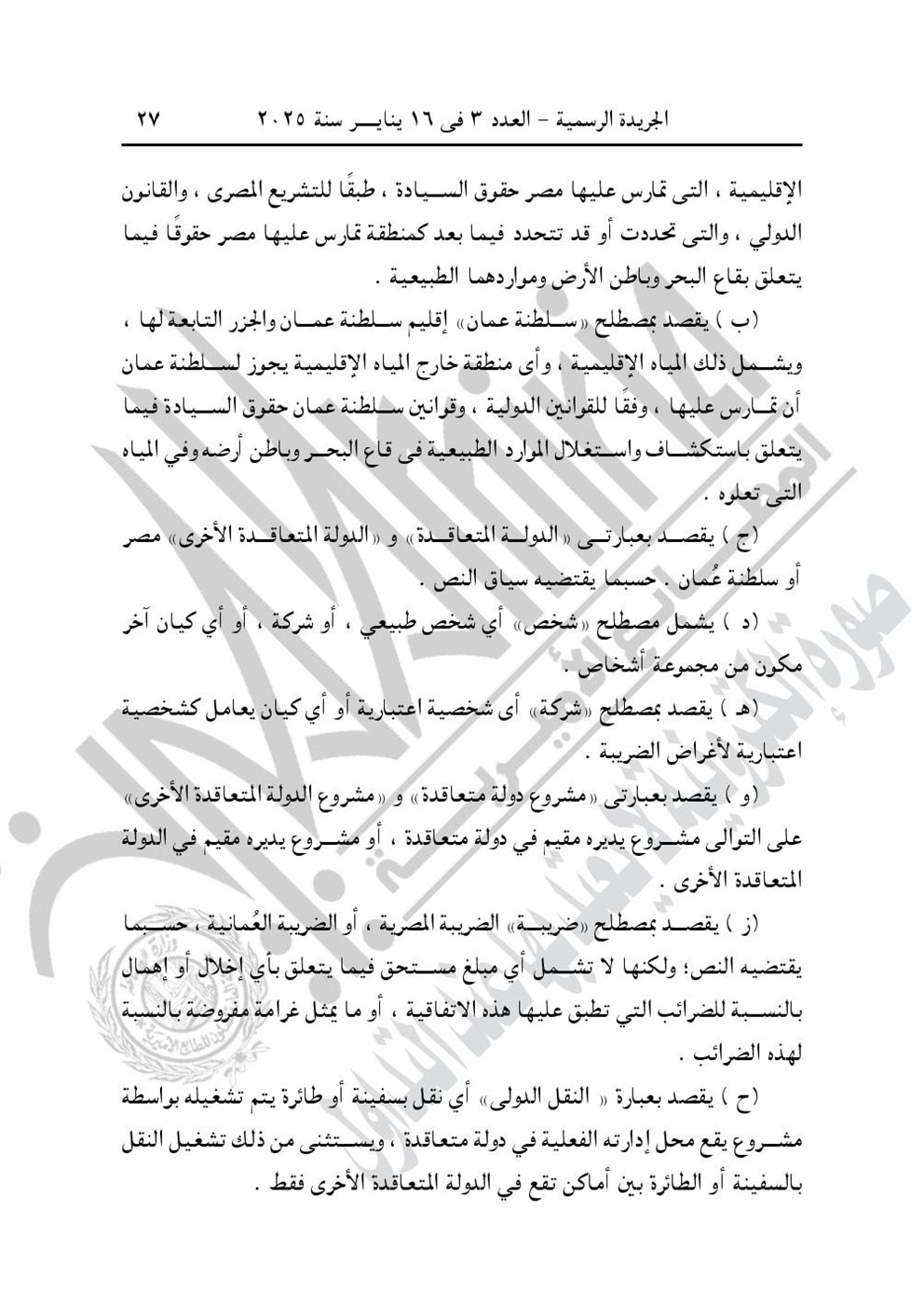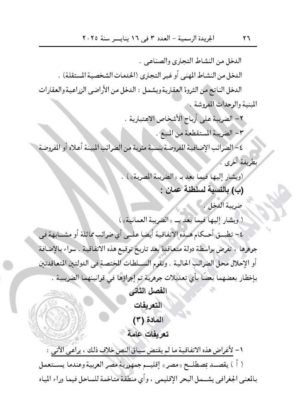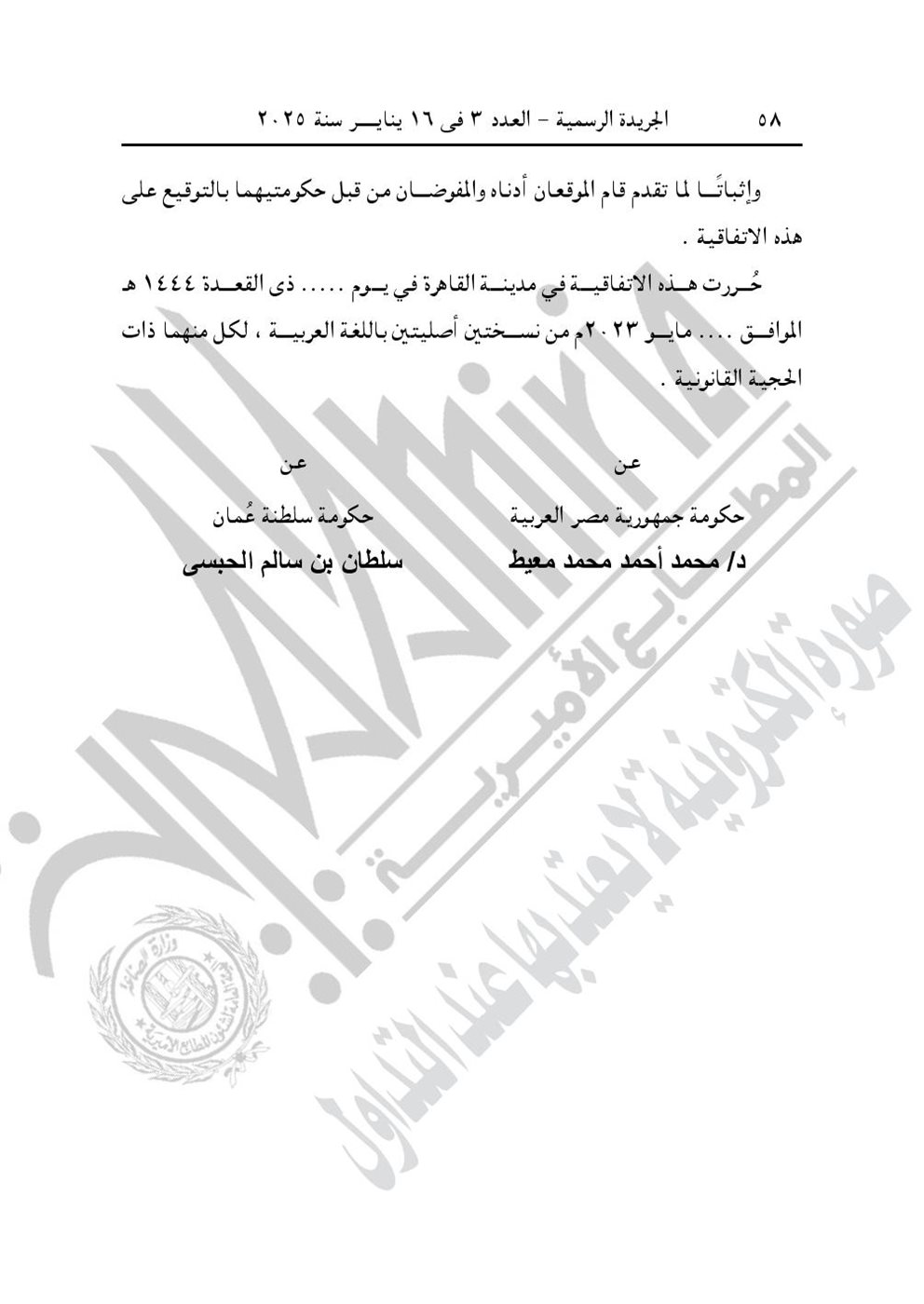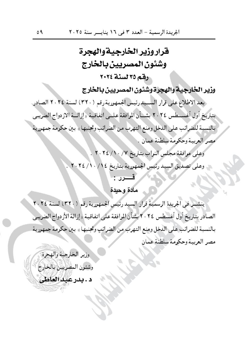 -وقرار رئيس الجمهورية رقـم 320 لسنة 2024، بشأن الموافقة على اتفاقية "إزالة الازدواج الضريبي" بالنسبة للضرائب على الدخل ومنع التهرب من الضرائب وتجنبها بين حكومة جمهورية مصر العربية وحكومة سلطنة عمان.
