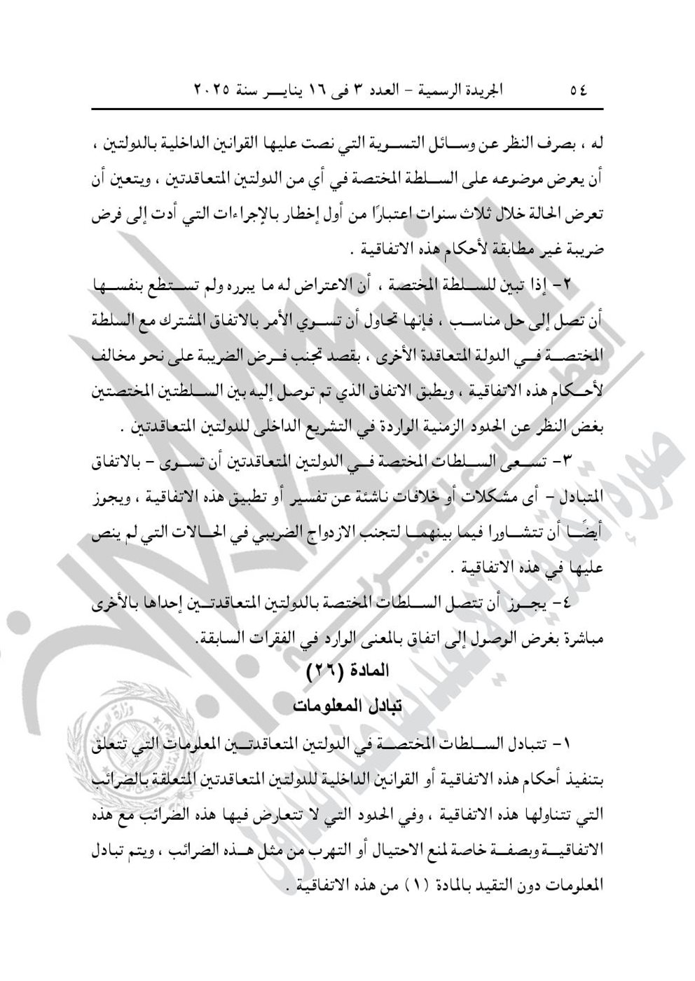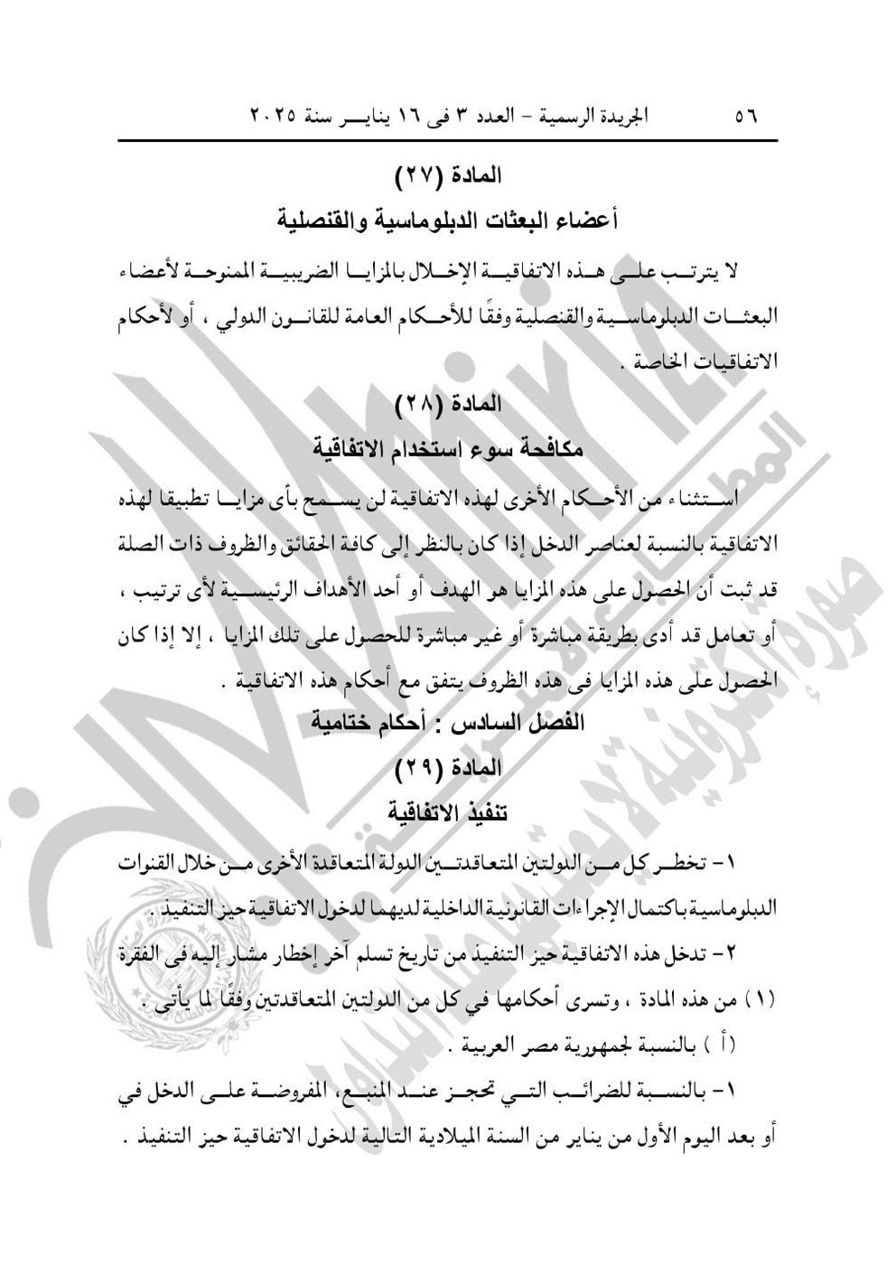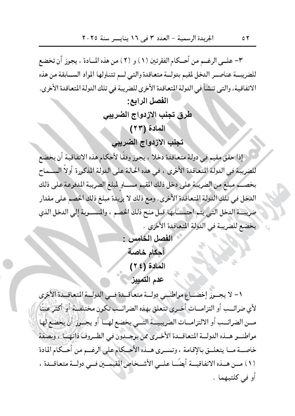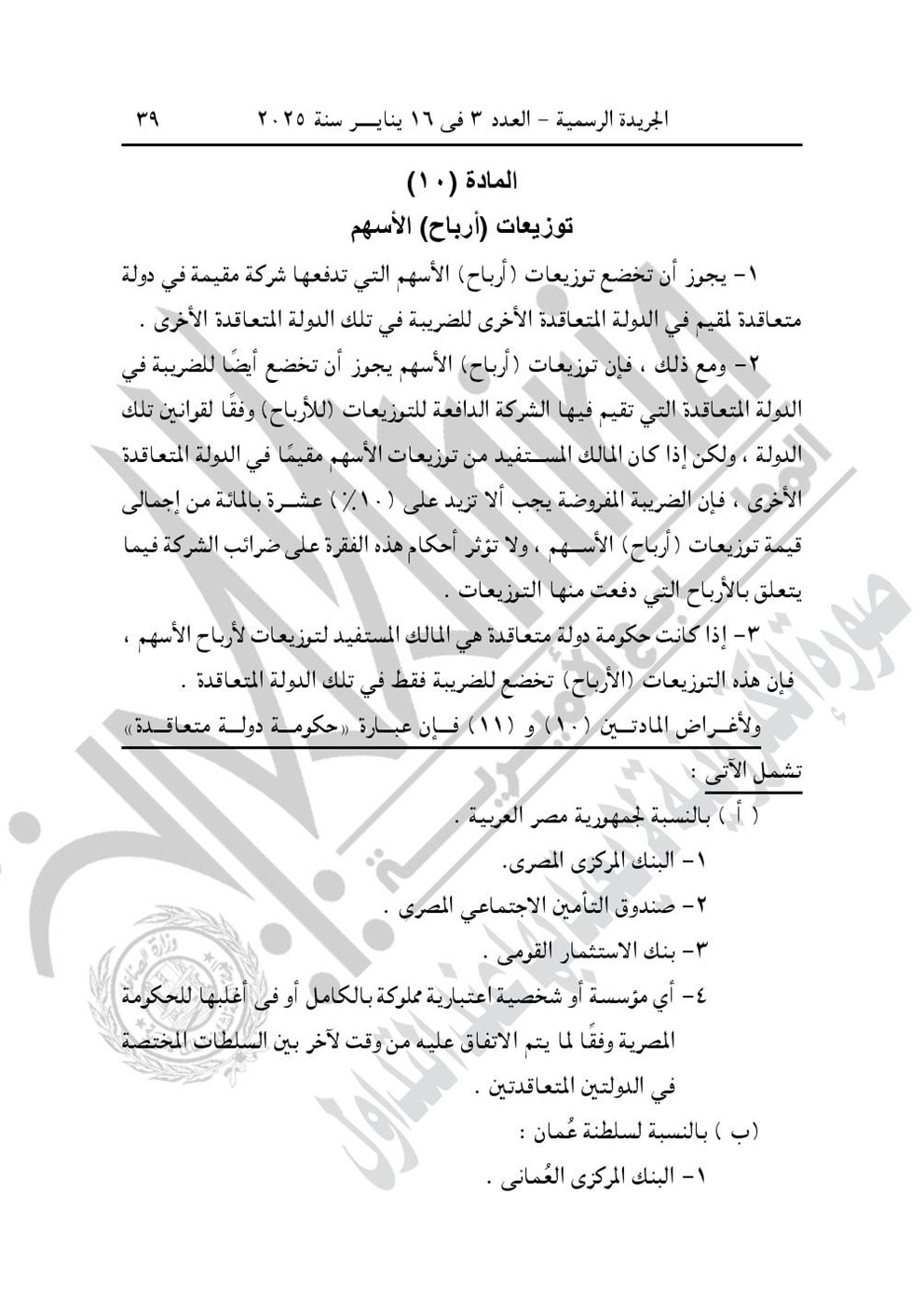 -وقرار رئيس الجمهورية رقـم 320 لسنة 2024، بشأن الموافقة على اتفاقية "إزالة الازدواج الضريبي" بالنسبة للضرائب على الدخل ومنع التهرب من الضرائب وتجنبها بين حكومة جمهورية مصر العربية وحكومة سلطنة عمان.