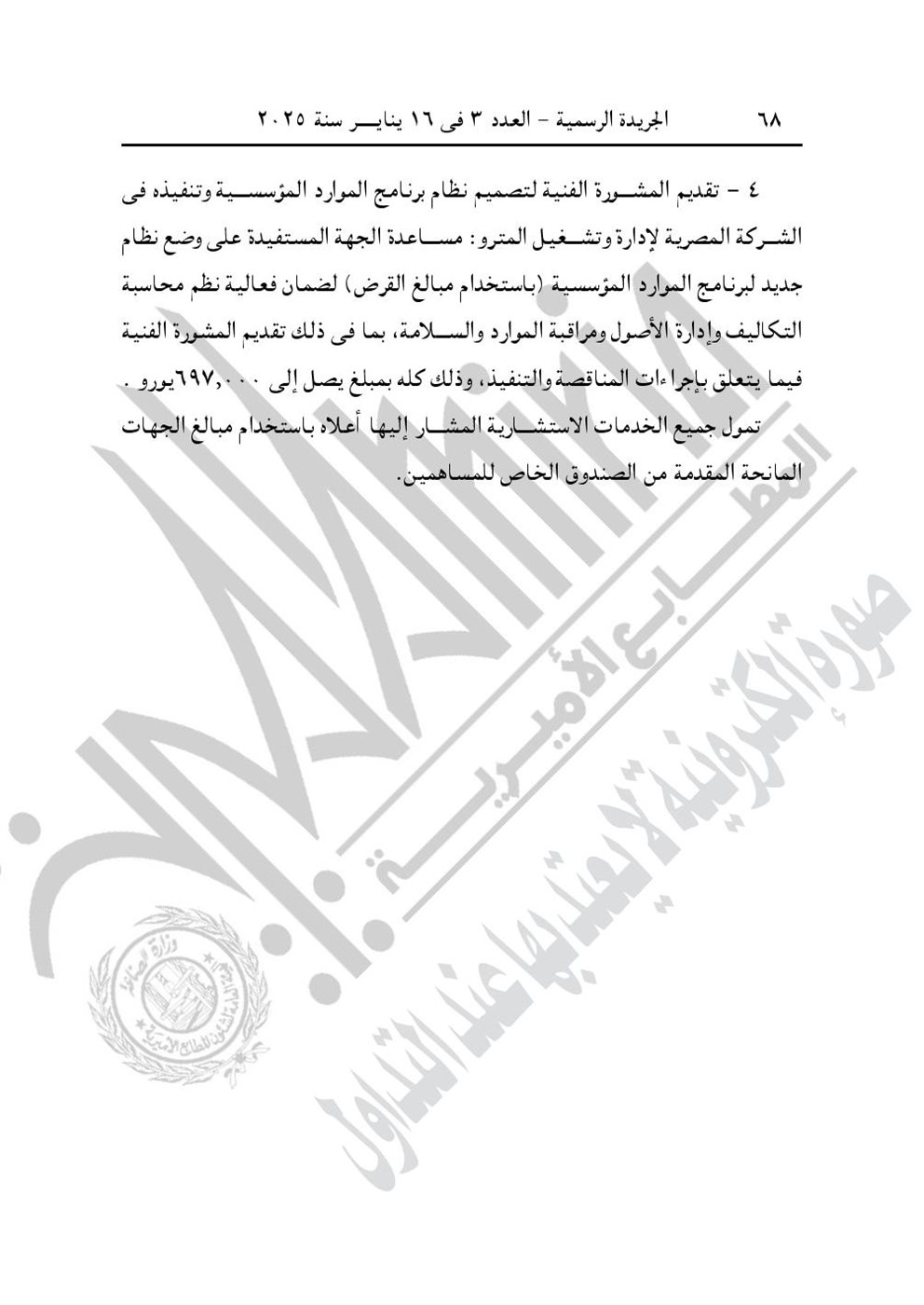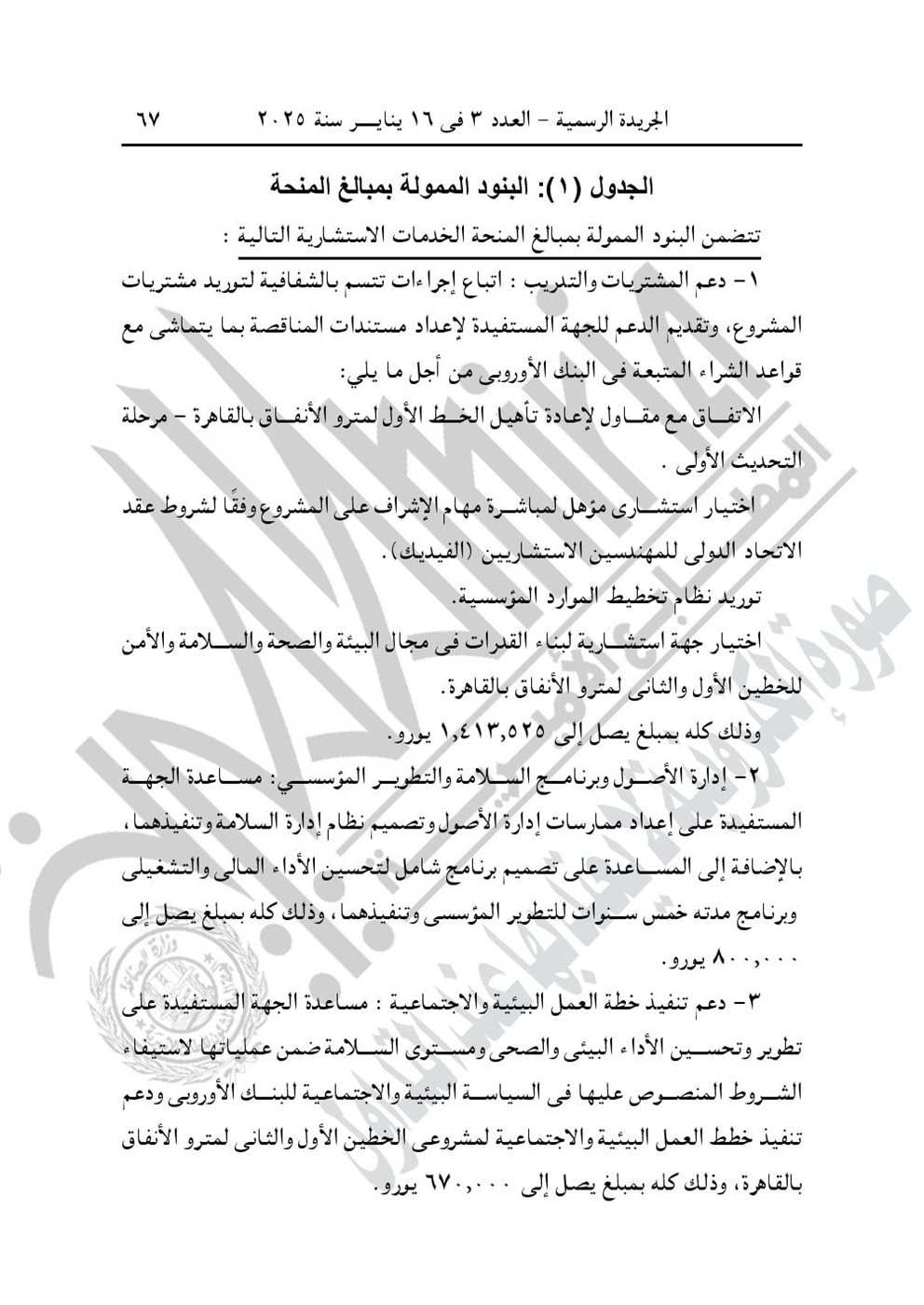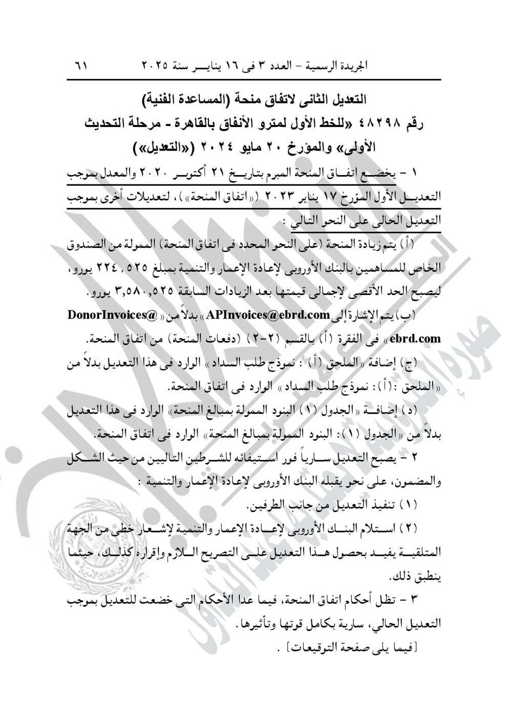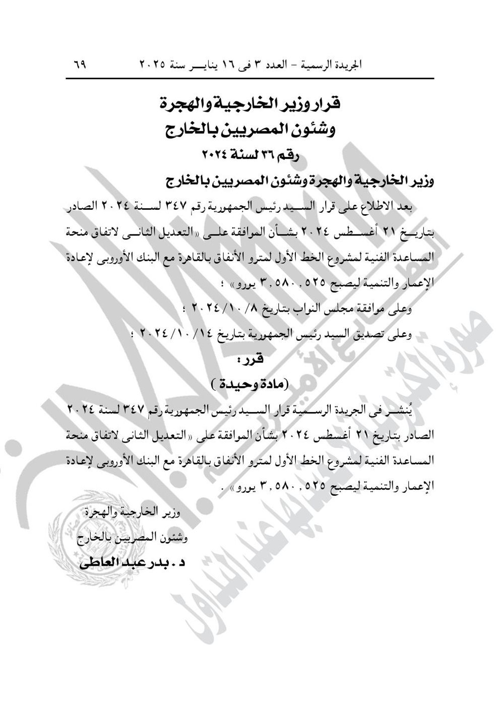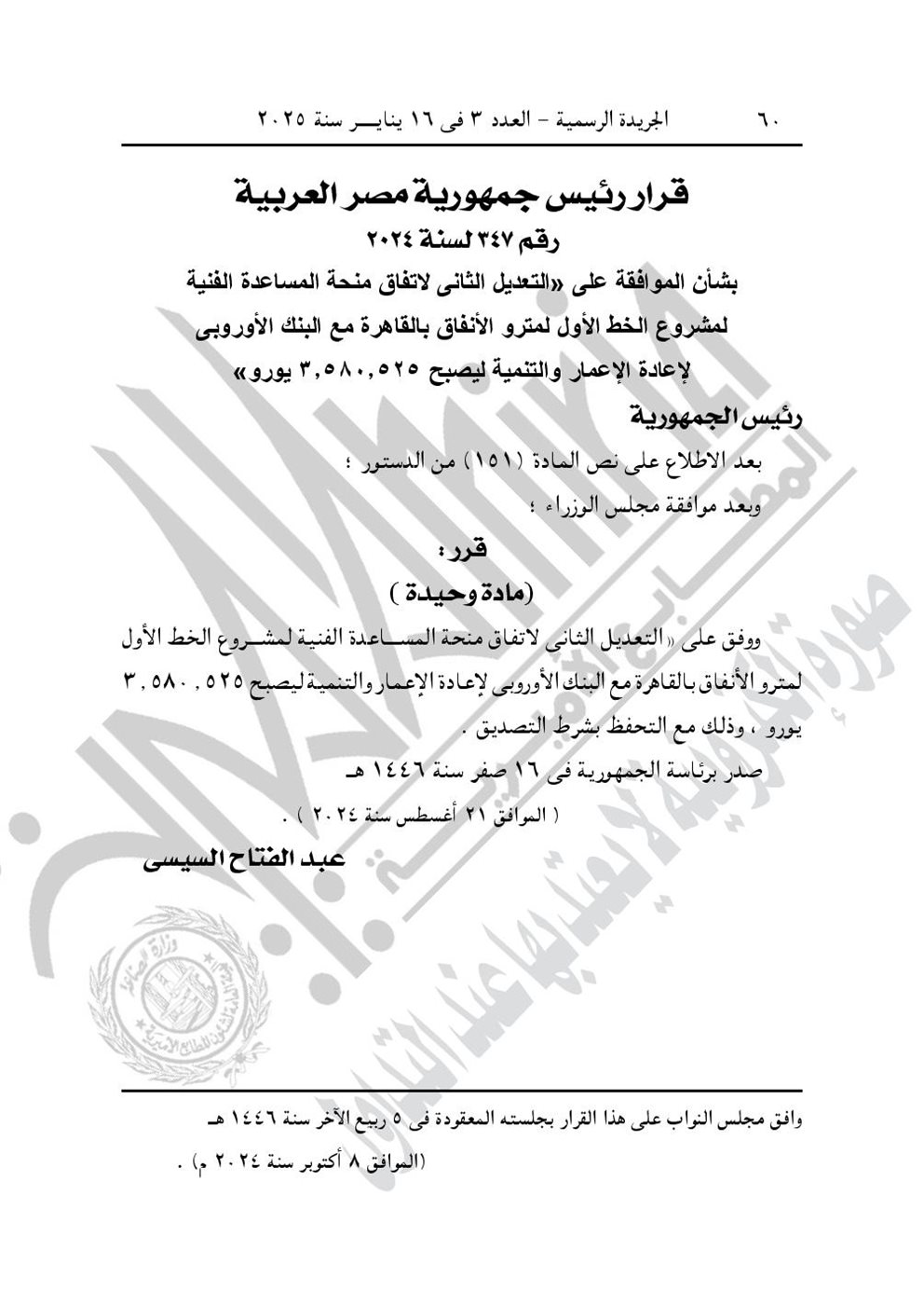 -والقرار الجمهوري رقم 347 لسنة 2024، بشأن الموافقة على "التعديل الثانى لاتفاق منحة المساعدة الفنية لمشروع الخط الأول لمترو الأنفاق بالقاهرة مع البنك الأوروبى لإعادة الإعمار والتنمية ليصبح 3٫580٫525 يورو.