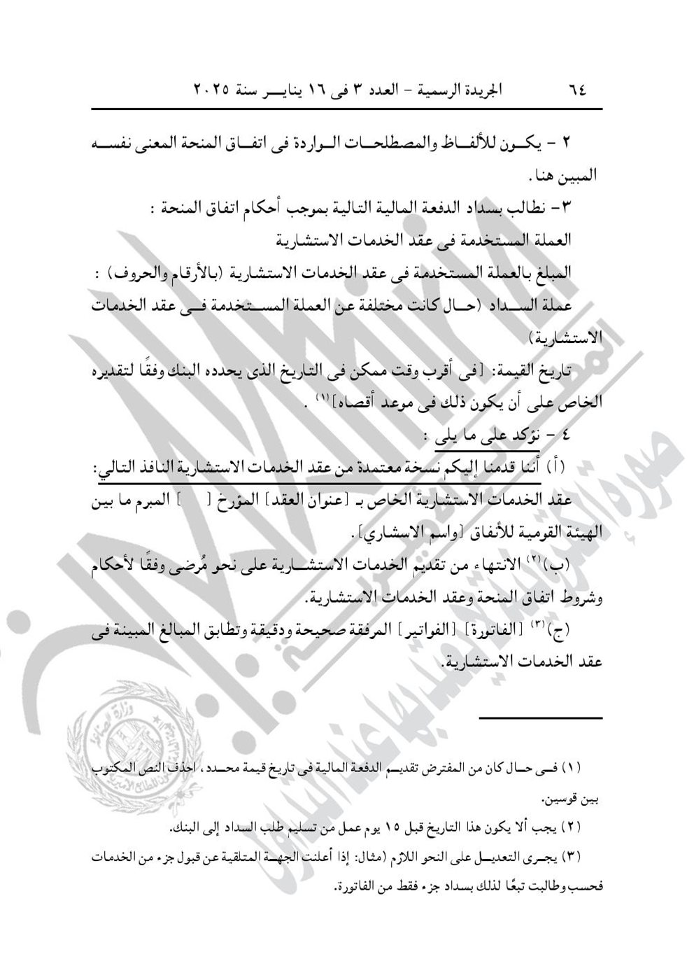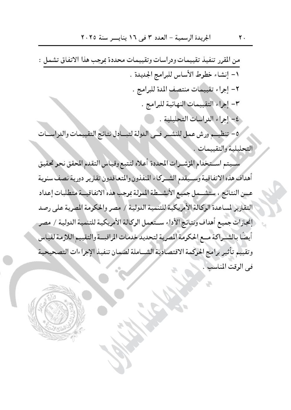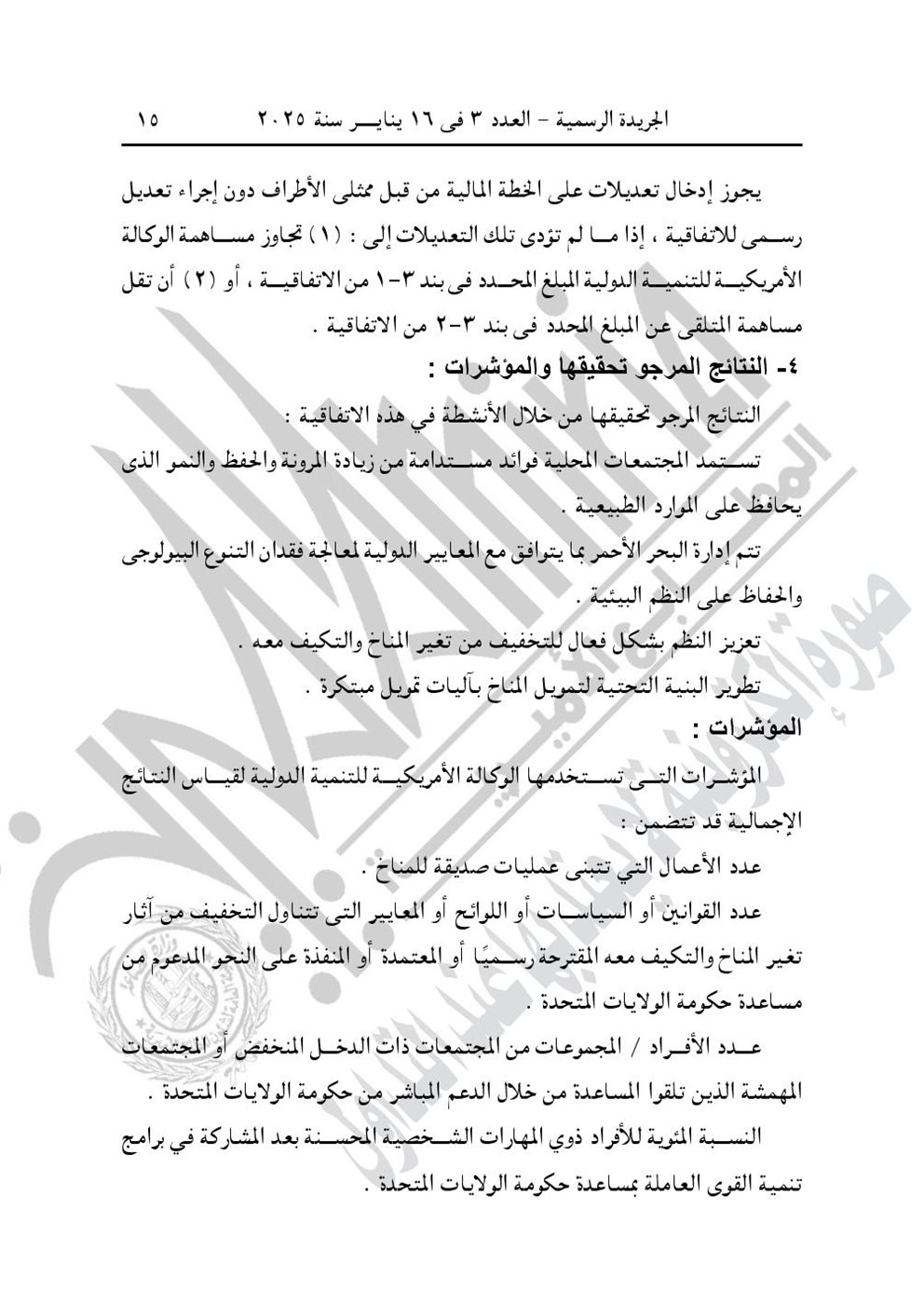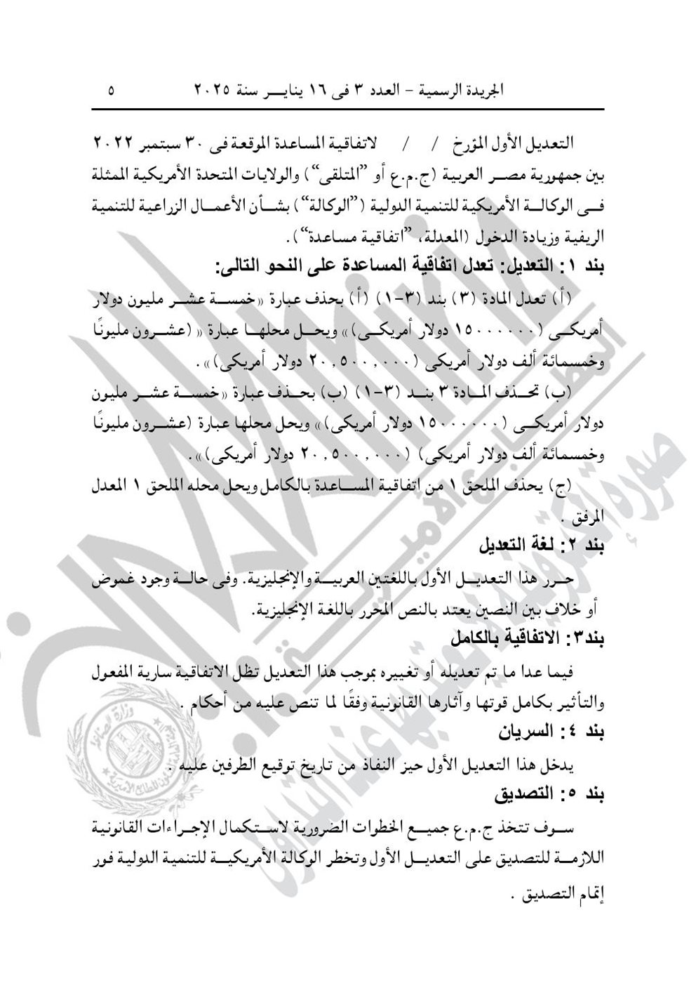 وتعدل الاتفاقية المساعدة بحذف عبارة "خمسة عشر مليون دولار أمريكي) 15000000 دولار أمريكى.. ويحل محلها عبارة (عشرون مليونا وخمسمائة ألف دولار أمريكى) 20.500.000 دولار أمريكي.