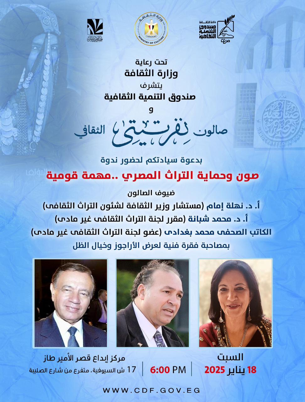 ويستضيف الصالون للمناقشة الدكتورة نهلة إمام أستاذ العادات والمعتقدات والمعارف الشعبية بمعهد الفنون الشعبية- أكاديمية الفنون- ومستشار وزير الثقافة لشئون التراث الثقافى، وعضو اللجنة الدولية للتقييم بمنظمة اليونسكو، والدكتور محمد شبانة أستاذ الموسيقى الشعبية بأكاديمية الفنون، ومقرر لجنة التراث الثقافى غير المادى بالمجلس الأعلى للثقافة، والكاتب الصحفى "محمد بغدادي" عضو لجنة التراث الثقافى غير المادى بالمجلس الأعلى للثقافة.