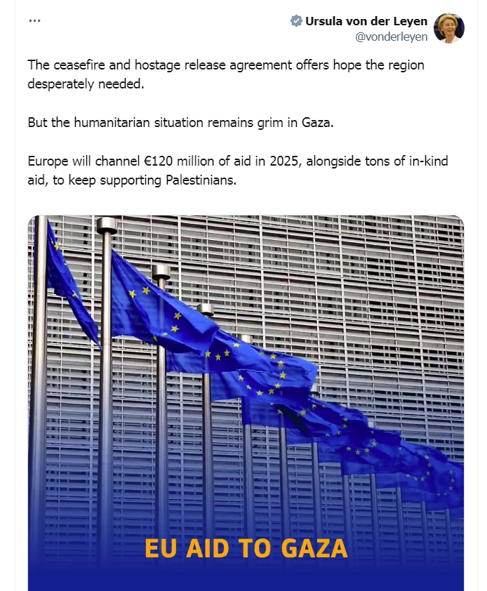 وأكدت أورسولا فون دير لاين أن أوروبا ستقوم بإرسال 120 مليون يورو من المساعدات في عام 2025، بالإضافة إلى إرسال أطنان من المساعدات العينية لمواصلة دعم الفلسطينيين، ووصفت الوضع الإنساني في غزة بأنه "قاتمًا".