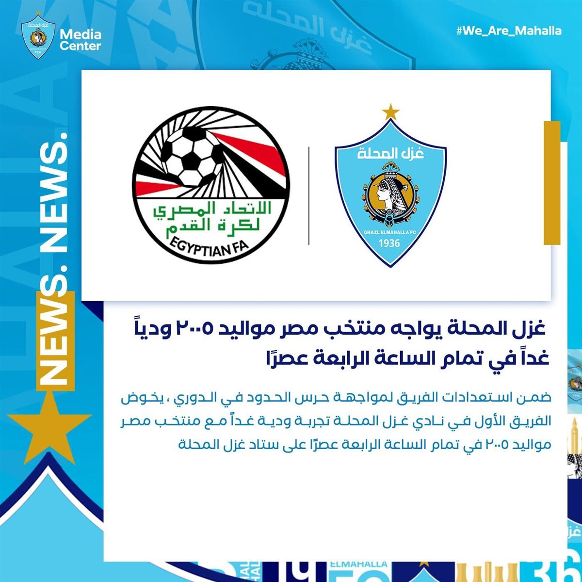 يواجه الفريق الاول لكرة القدم بالنادي غزل المحلة بقيادة مدربه الكابتن شوقي غريب نظيره منتخب الشباب مواليد 2005، وديا غدا الجمعة 17 يناير، في تمام الساعة الرابعة عصرا علي ستاد المحلة .