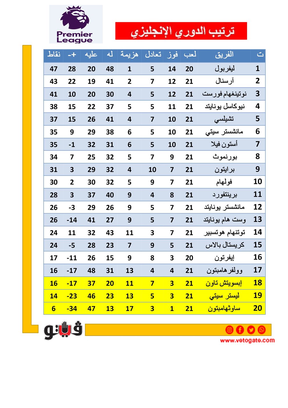 ترتيب الدوري الإنجليزي بعد الجولة الـ 21