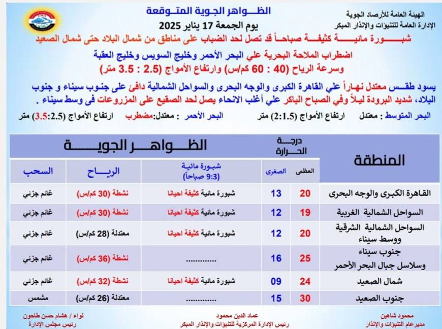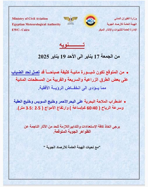 كما حذرت من شبورة مائية كثيفة تصل لحد الضباب بدءًا من اليوم الجمعة 17 يناير إلى الأحد 19 يناير 2025، مما يؤدي إلى انخفاض الرؤية الأفقية.