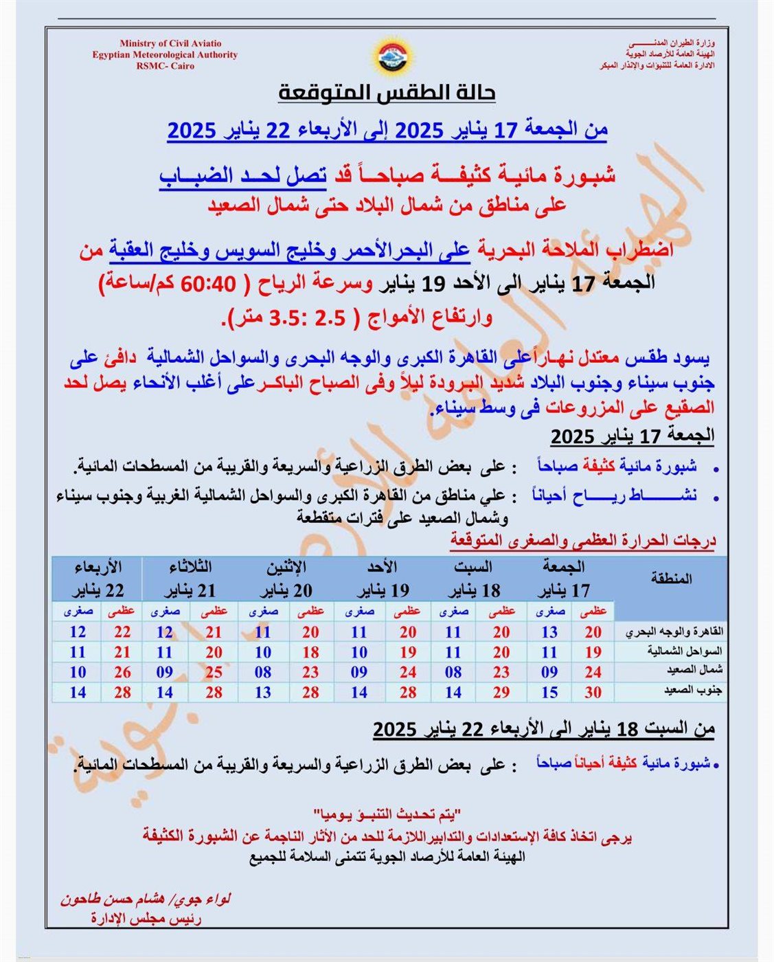 وقالت هيئة الأرصاد أنه بدءا من اليوم الجمعة 17 يناير إلى الأحد 19 يناير 2025 يشهد الطقس اضطراب الملاحة البحرية على البحر الأحمر وخليج السويس وخليج العقبة وسرعة الرياح (40:60 كم /ساعة) وارتفاع الأمواج من (2.5:3.5 متر)
