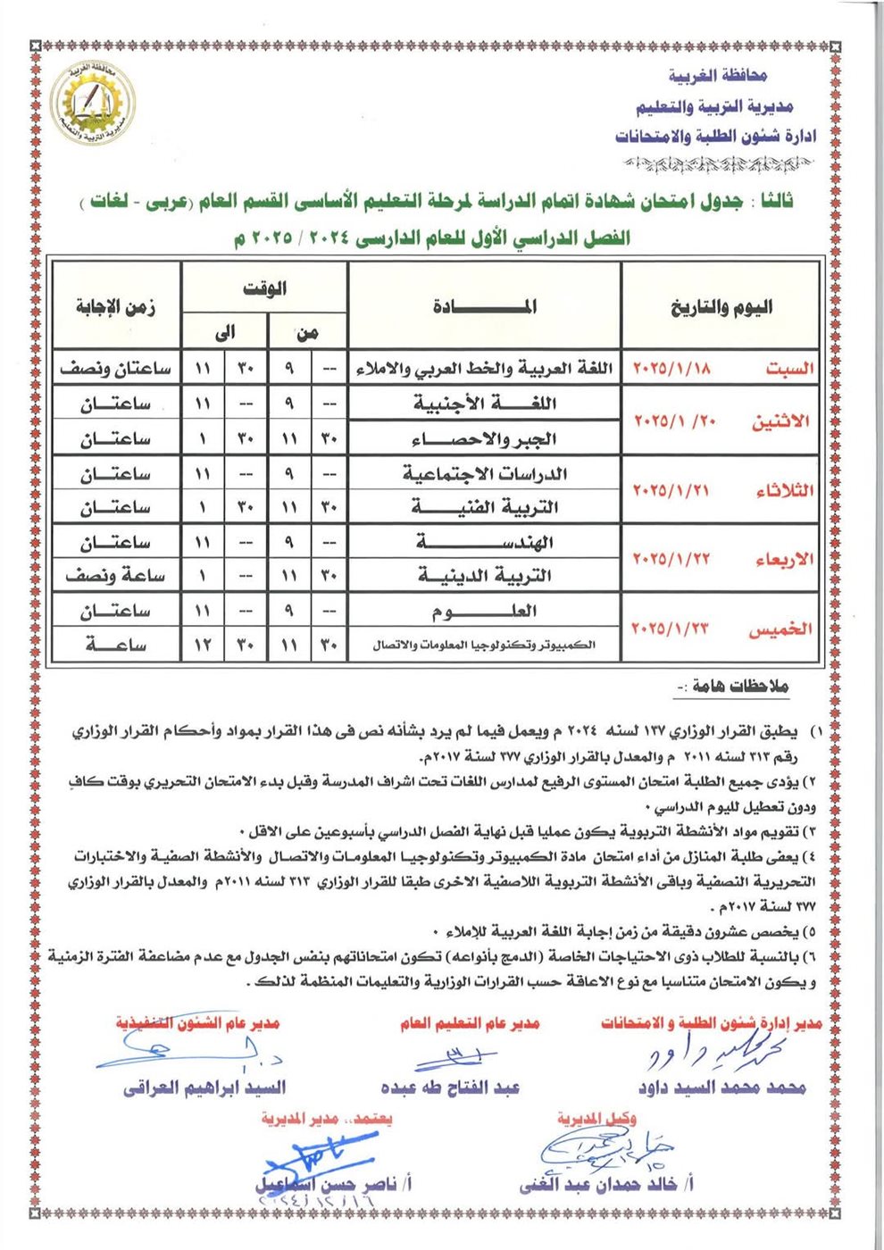 وشدد وكيل تعليم الغربية على منع استخدام الهواتف المحمولة أو أي أجهزة إلكترونية داخل اللجان، كما أكد على غلق أبواب اللجان عند بدء الامتحانات ومنع دخول أو خروج أي شخص خلالها. وأشار إلى ضرورة تشكيل لجنة كنترول داخل كل لجنة رئيسية لتسليم واستلام أوراق الأسئلة وكراسات الإجابة.