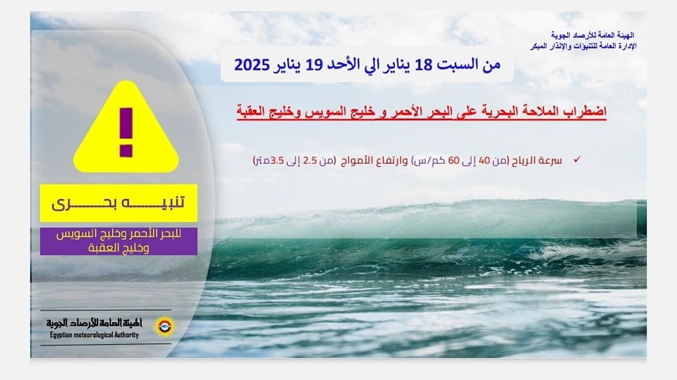 وقالت هيئة الأرصاد في بيانها: "من السبت 18 يناير والأحد 19 يناير 2025 اضطراب الملاحة البحرية على البحر الأحمر وخليج السويس وخليج العقبة وسرعة الرياح (40:60 كم /ساعة) وارتفاع الأمواج من (2.5:3.5 متر).