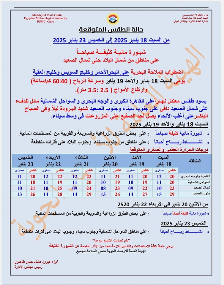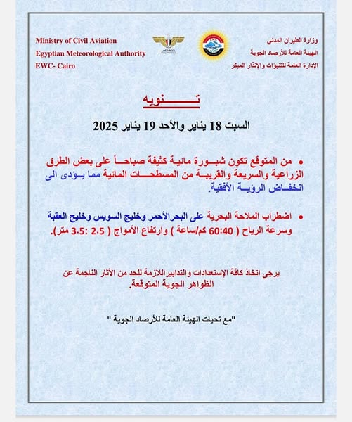 كما حذرت هيئة الأرصاد في بيان آخر من الشبورة المائية الكثيفة وقالت: "من السبت 18 يناير والأحد 19 يناير 2025 شبورة مائية كثيفة تصل لحد الضباب مما يؤدى إلى انخفاض الرؤية الأفقية.