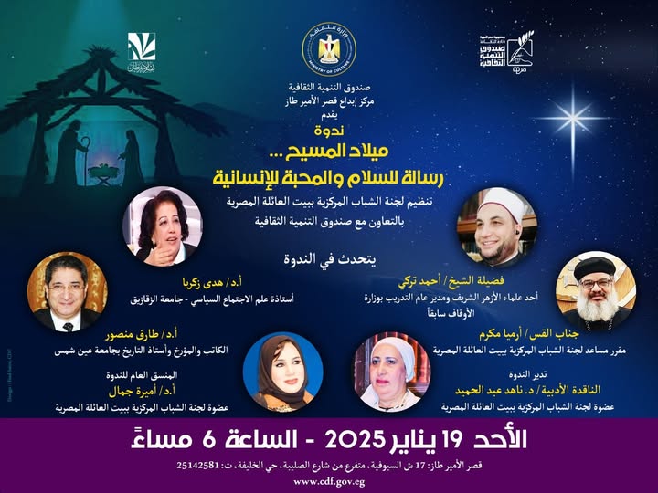 يستضيف قصر الأمير طاز بالخليفة التابع لقطاع صندوق التنمية الثقافية بالتعاون مع لجنة الشباب المركزية ببيت العائلة المصرية، ندوة ثقافية بعنوان "ميلاد المسيح.. رسالة للسلام والمحبة للإنسانية"، وذلك في تمام السادسة مساء غدًا الأحد الموافق 19 يناير.