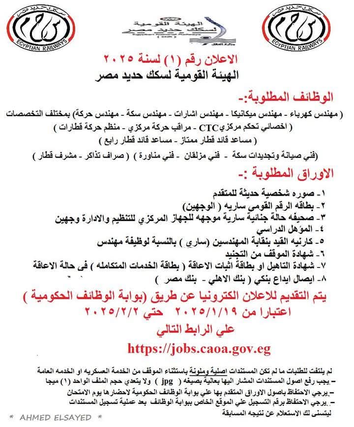 أعلنت الهيئة القومية للسكك الحديد، بالتعاون مع الجهاز الادارى للدولة بدء تلقى طلبات التشغيل على عدد من الوظائف الشاغرة بالهيئة، بينها عمال ومهندسين ووظائف تخصصية