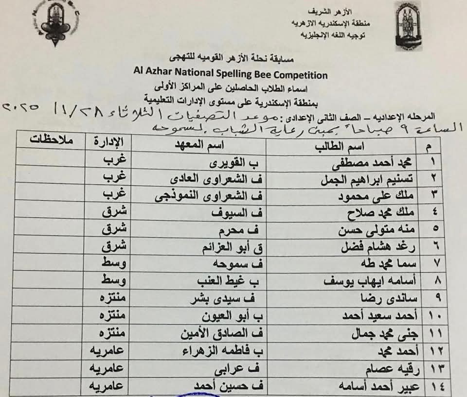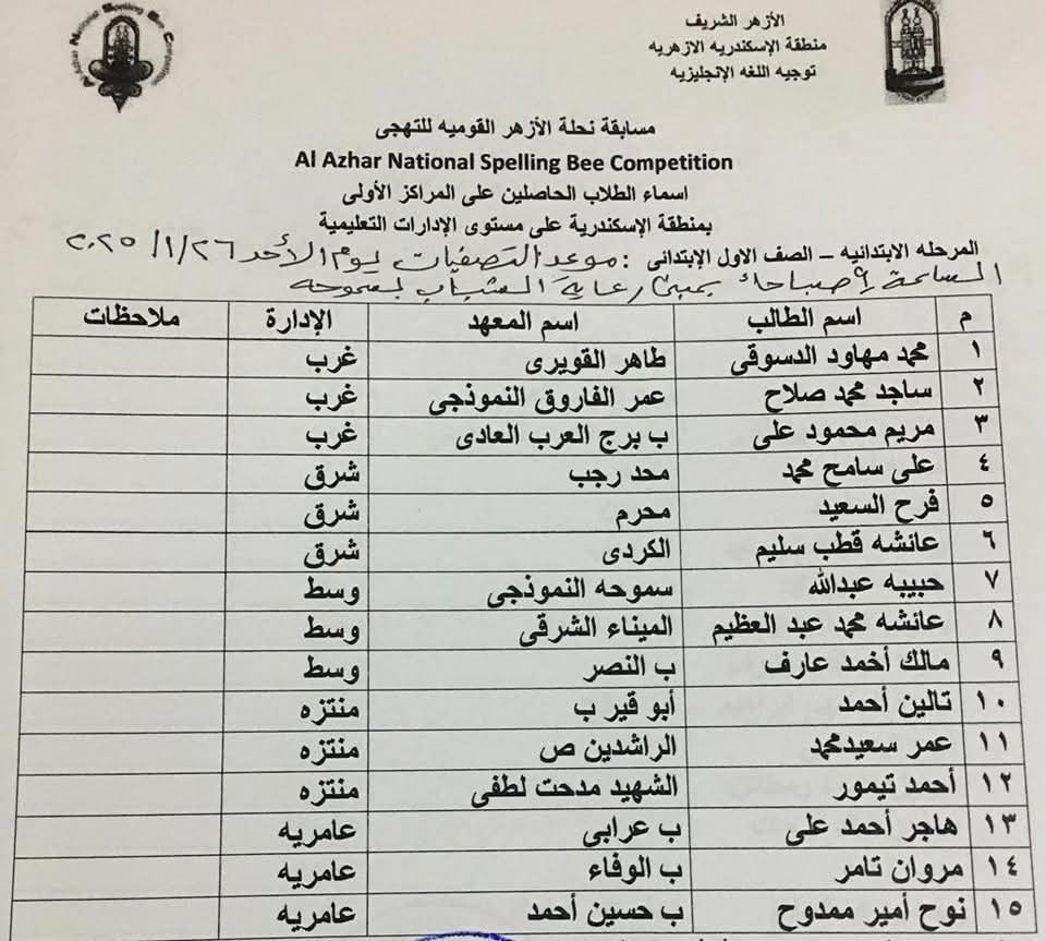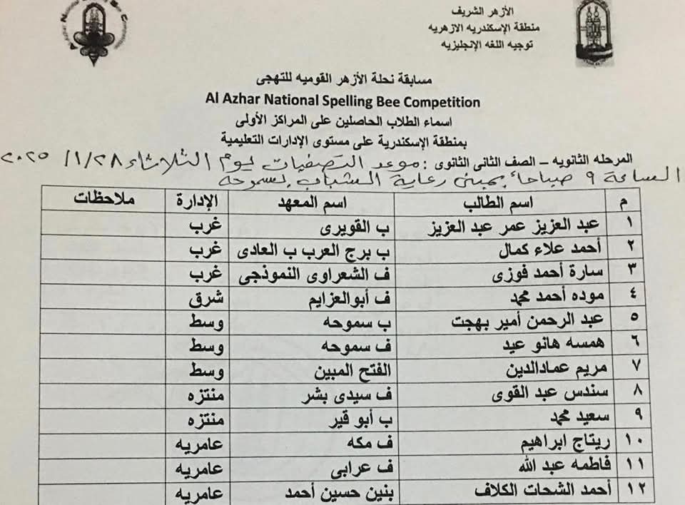 أعلنت منطقة الإسكندرية الأزهرية، برعاية الدكتور عبد العزيز أبو خزيمة، رئيس الإدارة المركزية، وتحت إشراف نعمة علام، القائم بعمل موجه عام اللغة الإنجليزية، أسماء الطلاب المتسابقين على مستوى المنطقة، في مسابقة (نحلة التهجى القومية)، والمقرر انعقادها بمبنى بيت شباب الأزهر بسموحة، بداية من الأحد القادم الموافق ٢٦ يناير الجاري، وحتى الثلاثاء الموافق من نفس الشهر.