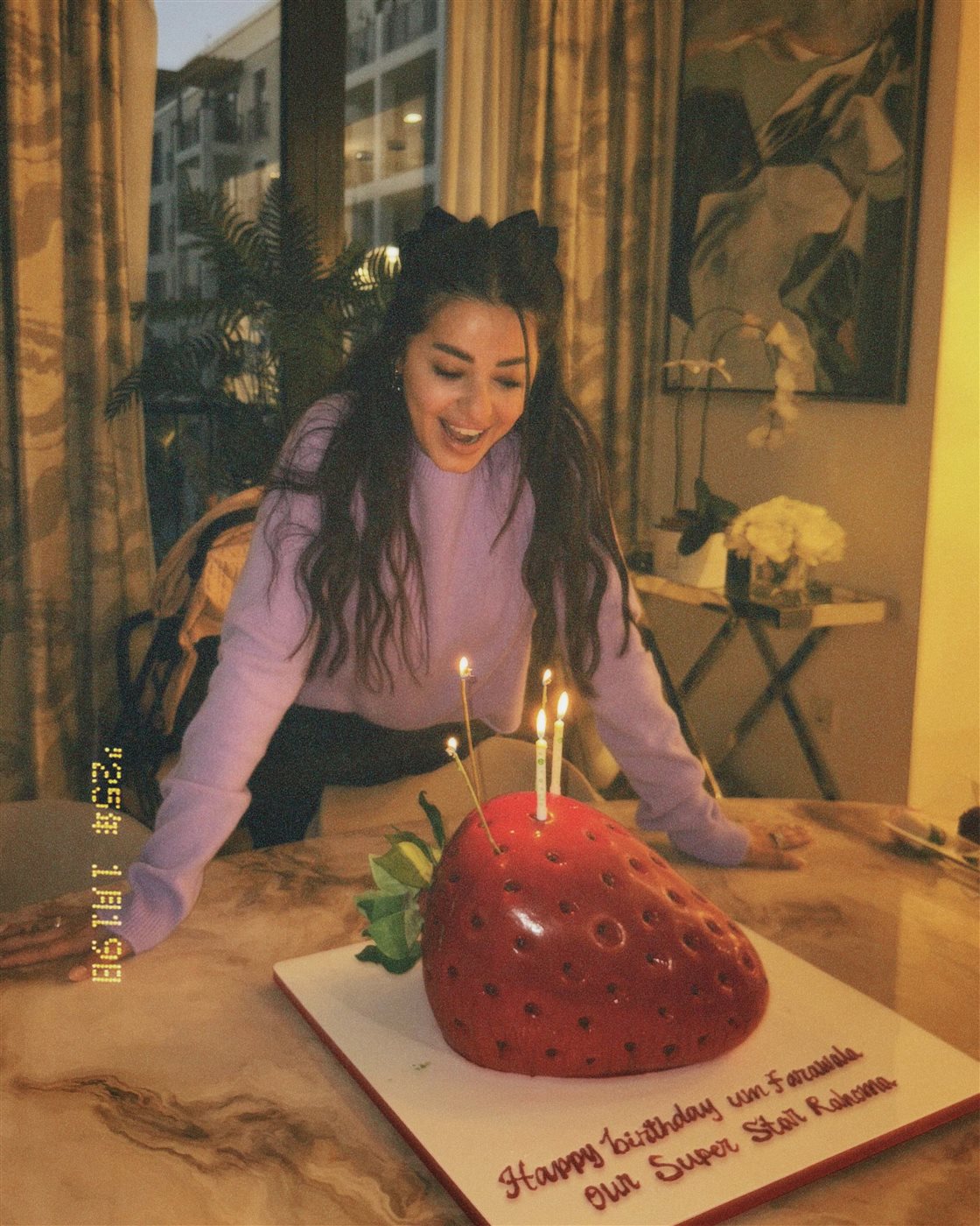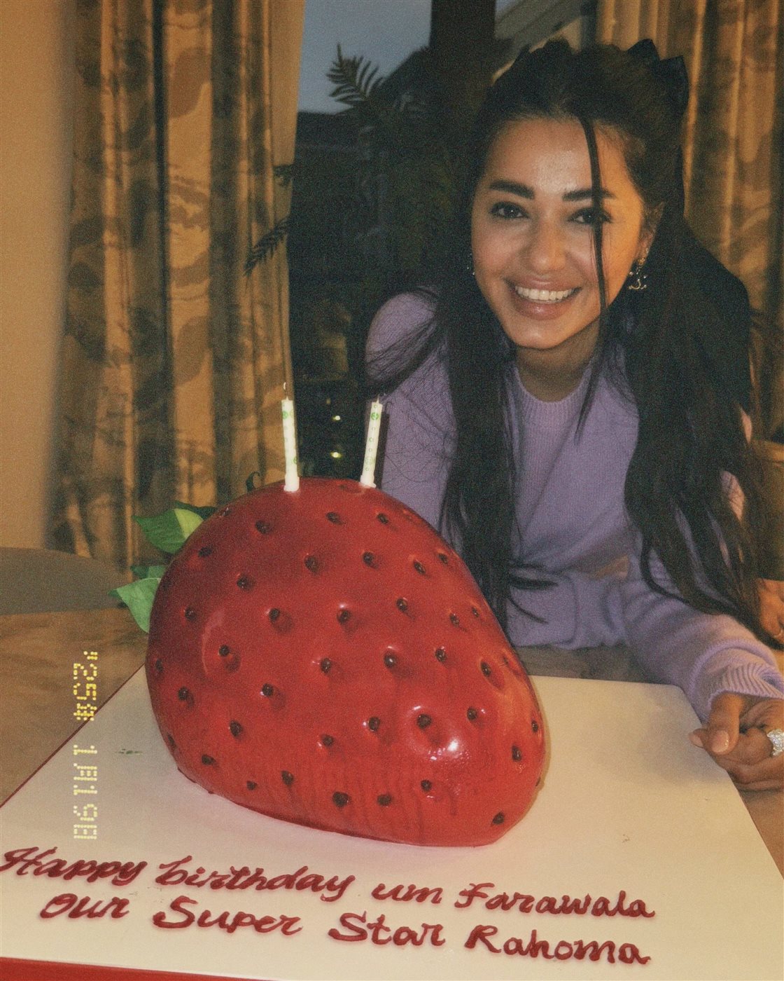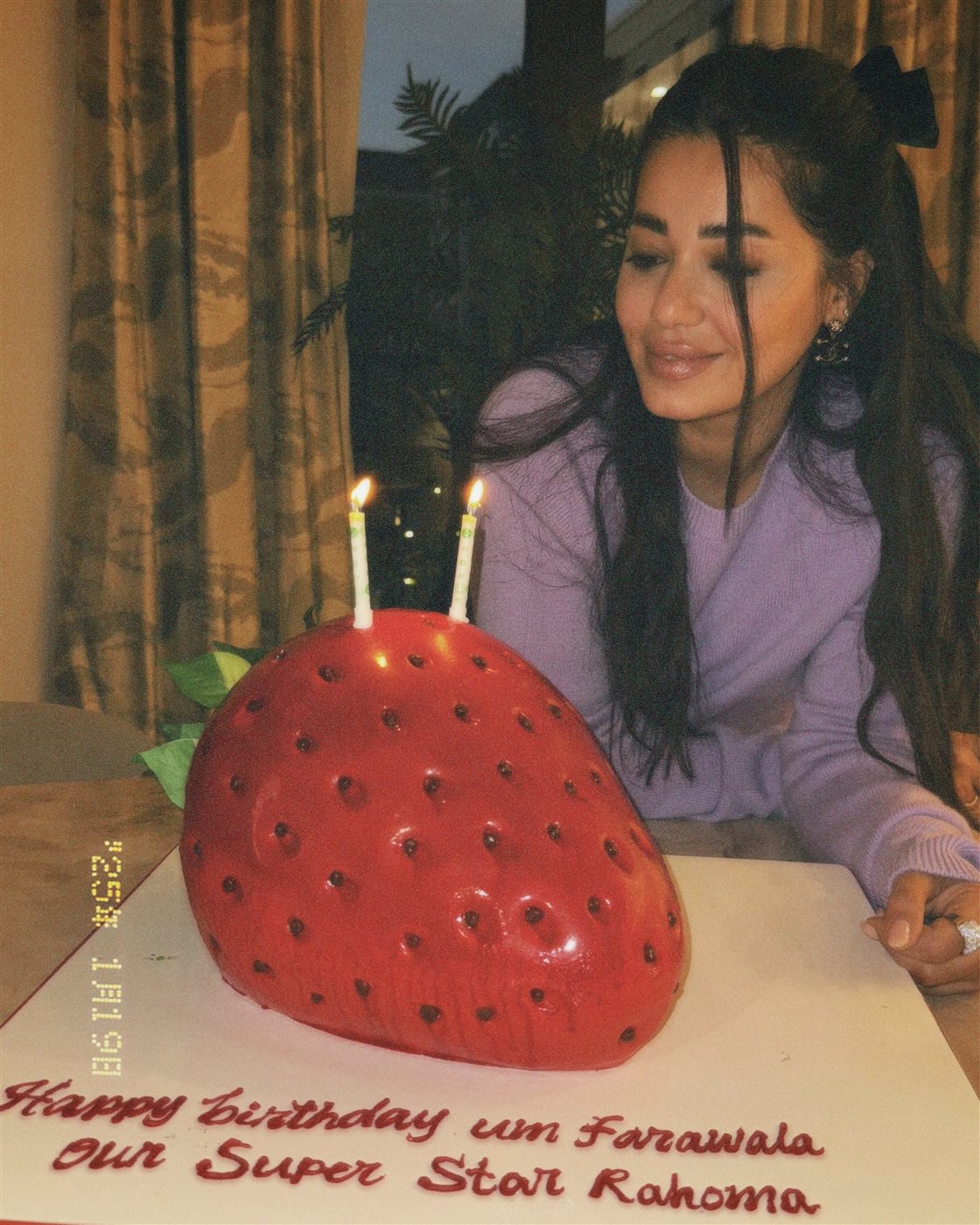 ونشرت رحمة رياض صورا من حفل عيد الميلاد وكتبت: وهذا أول عيد ميلاد وأنا ماما لأحلى بنيه بالعالم فراولتي الله يخليها لي، ويا ربّ يحفظ لي أهلي عائلتي الحنونه حبايب قلبي ولا يحرمني من وجودكم بحياتي.. شكرًا من قلبي لكل من عايدني شكرًا على محبتكم ومشاعركم الصادقة... أحبكم.
