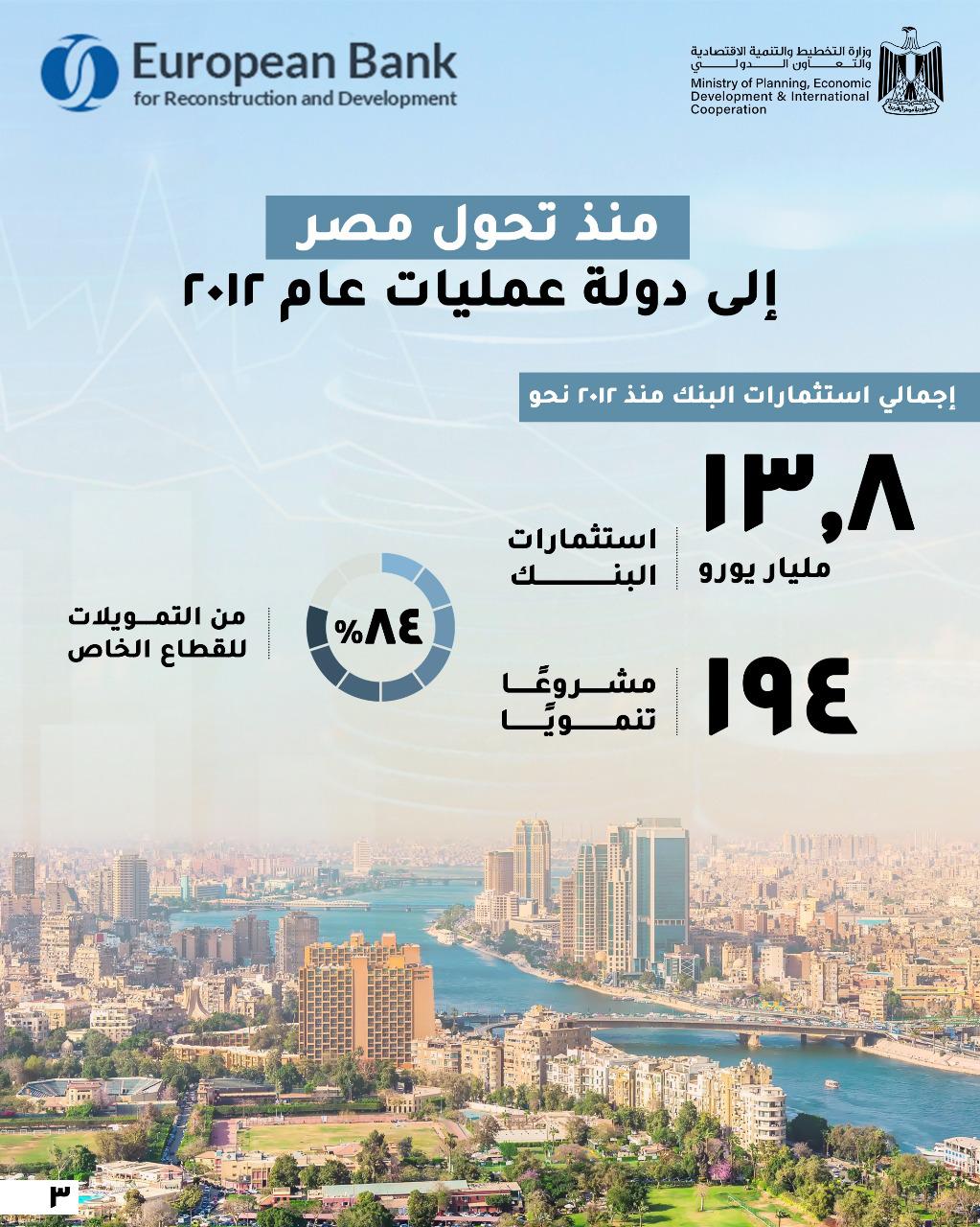 ومنذ تحول مصر إلى دولة عمليات عام 2012، اتخذت العلاقات المُشتركة مع البنك الأوروبي لإعادة الإعمار والتنمية، تحولًا كبيرًا، وعكفت الدكتورة رانيا المشاط، وزيرة التخطيط والتنمية الاقتصادية والتعاون الدولي، منذ عام 2020، على تطوير العلاقات الاقتصادية مع شركاء التنمية متعددي الأطراف والثنائيين.
