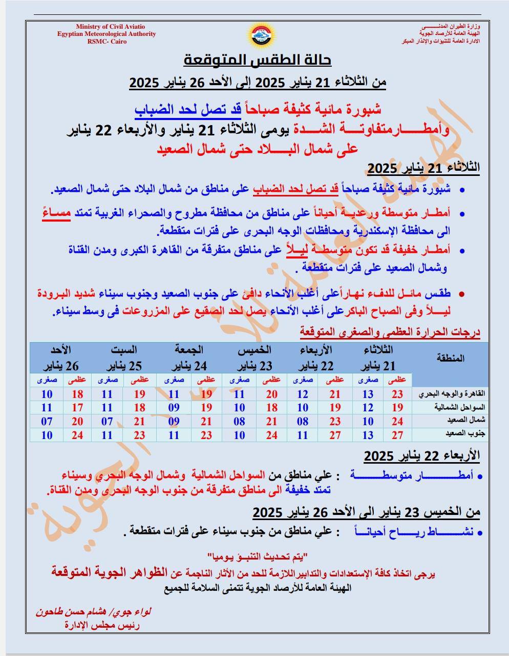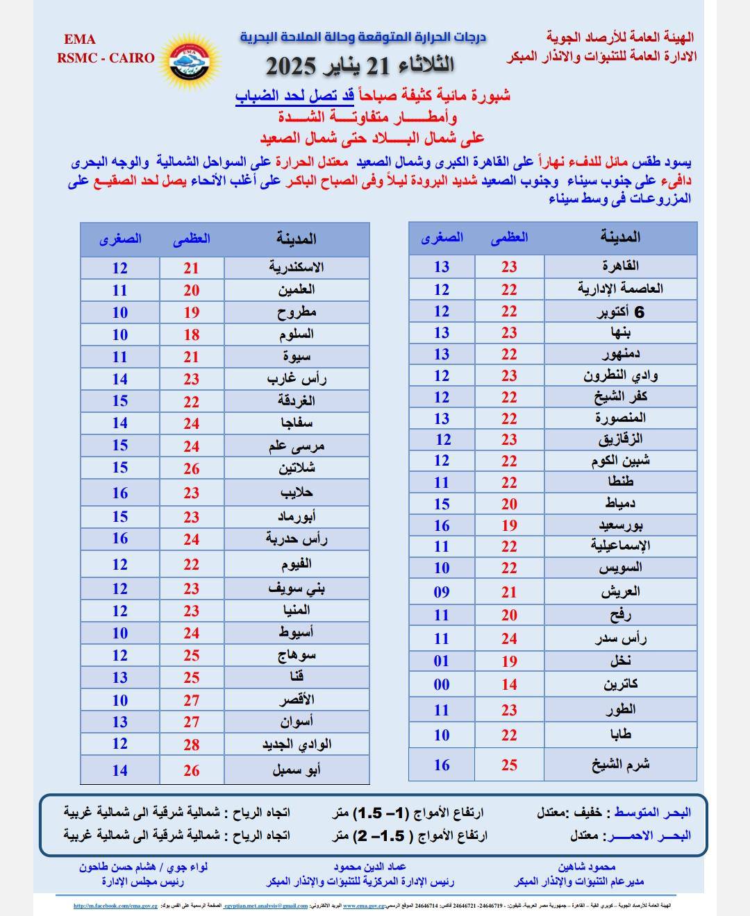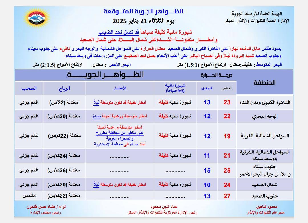 ونشرت هيئة الأرصاد الجوية بيانا بدرجات الحرارة المتوقعة اليوم الثلاثاء 21 يناير 2025، وجاءت كالتالي: