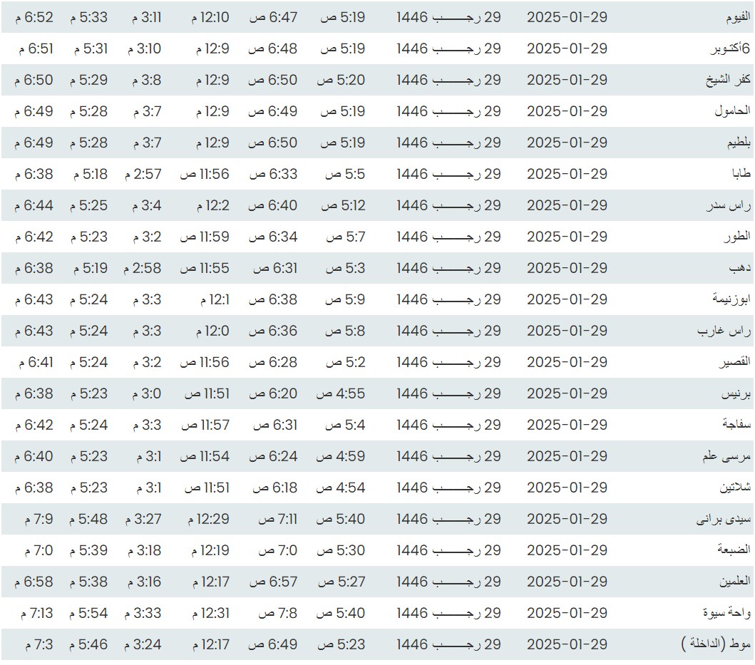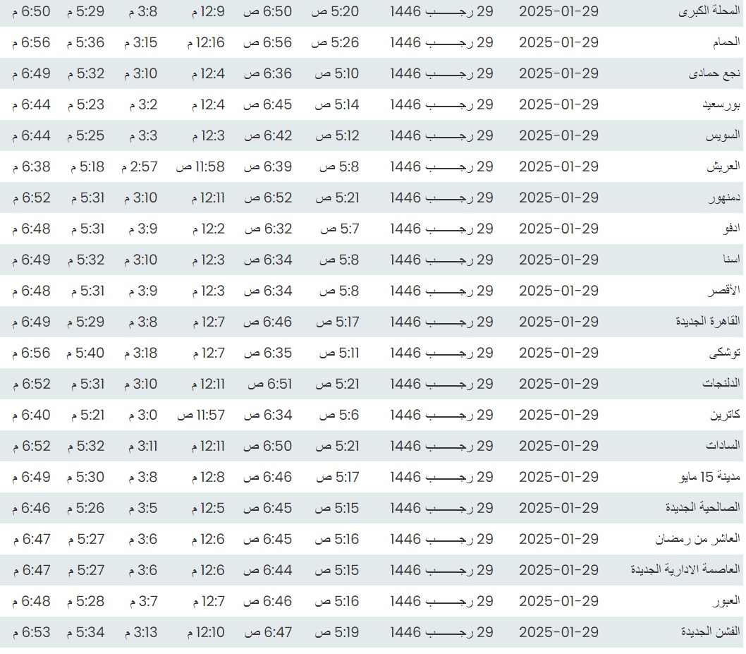 مواقيت الصلاة اليوم الأربعاء 29 - 1- 2025 في القاهرة والمحافظات