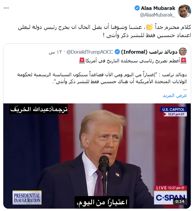 وجه علاء مبارك، نجل الرئيس الراحل حسني مبارك، رسالة قوية للرئيس الأمريكي دونالد ترامب، تعليقًا على الخطاب الذي ألقاه في مراسم تنصيبه، والذي أكد فيه أن سياسة الولايات المتحدة الرسمية تقر وجود جنسين فقط للبشر ذكر وأنثى.