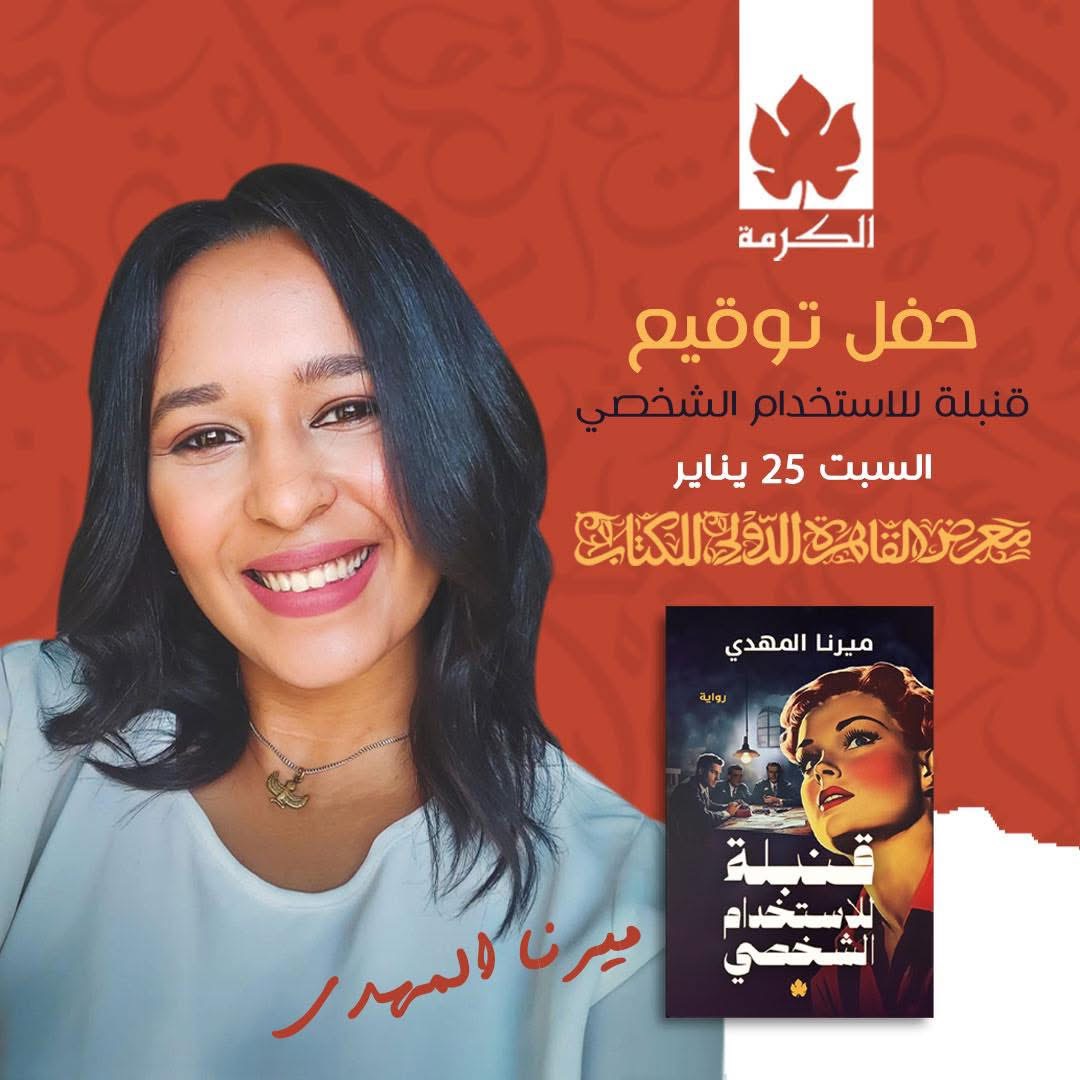 تقيم دار الكرمة للنشر والتوزيع، حفل توقيع رواية “قنبلة للاستخدام الشخصي” للكاتبة ميرنا المهدي، يوم السبت المقبل الموافق 25 يناير الجاري، وذلك ضمن فعاليات معرض القاهرة الدولي للكتاب 2025.