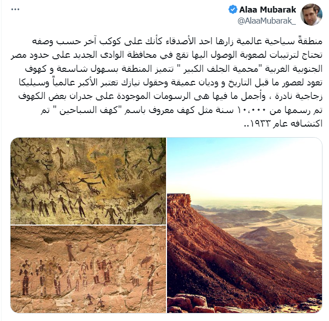 وقال علاء مبارك عن المزار العالمي في مصر: "منطقة سياحية عالمية زارها أحد الأصدقاء كأنك على كوكب آخر حسب وصفه تحتاج لترتيبات لصعوبة الوصول إليها تقع في محافظة الوادى الجديد على حدود مصر الجنوبية الغربية “محمية الجلف الكبير”".