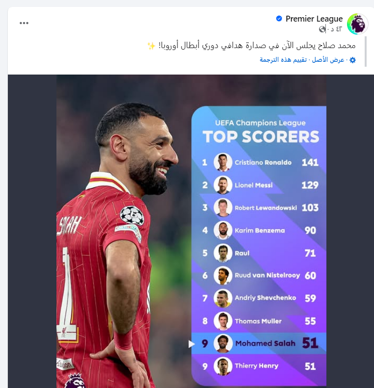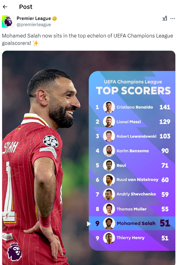 ونشرت الصفحة: "محمد صلاح يجلس الآن في صدارة هدافي دوري أبطال أوروبا!".