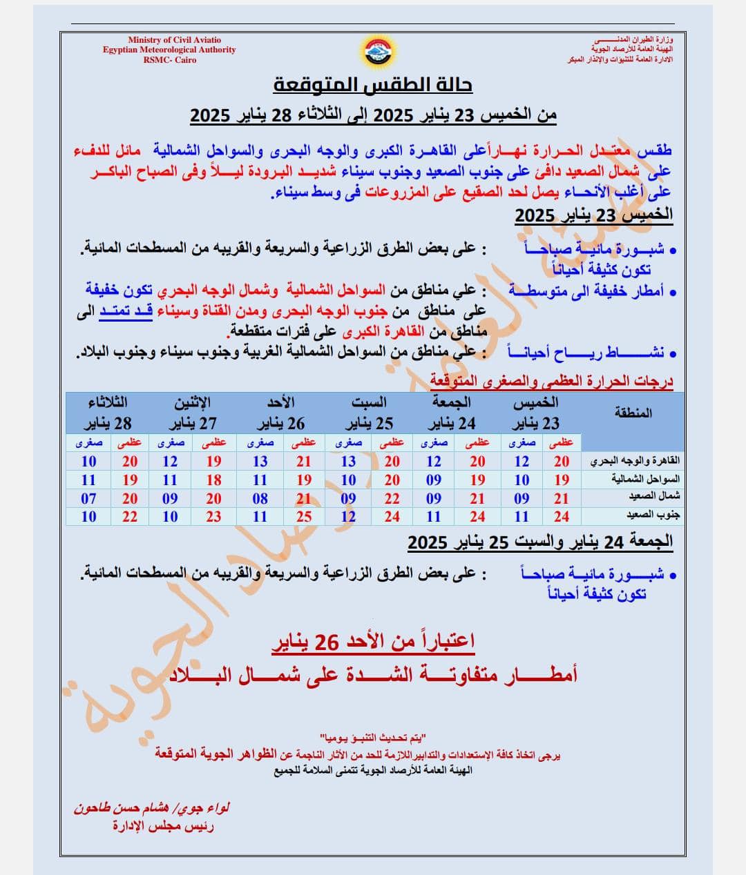 وعن طقس غدا الجمعة 24 يناير 2025 حتى السبت 25 يناير، أكدت هيئة الأرصاد أن يشهد شبورة مائية صباحية على بعض الطرق الزراعية والسريعة والقريبة من المسطحات المائية.