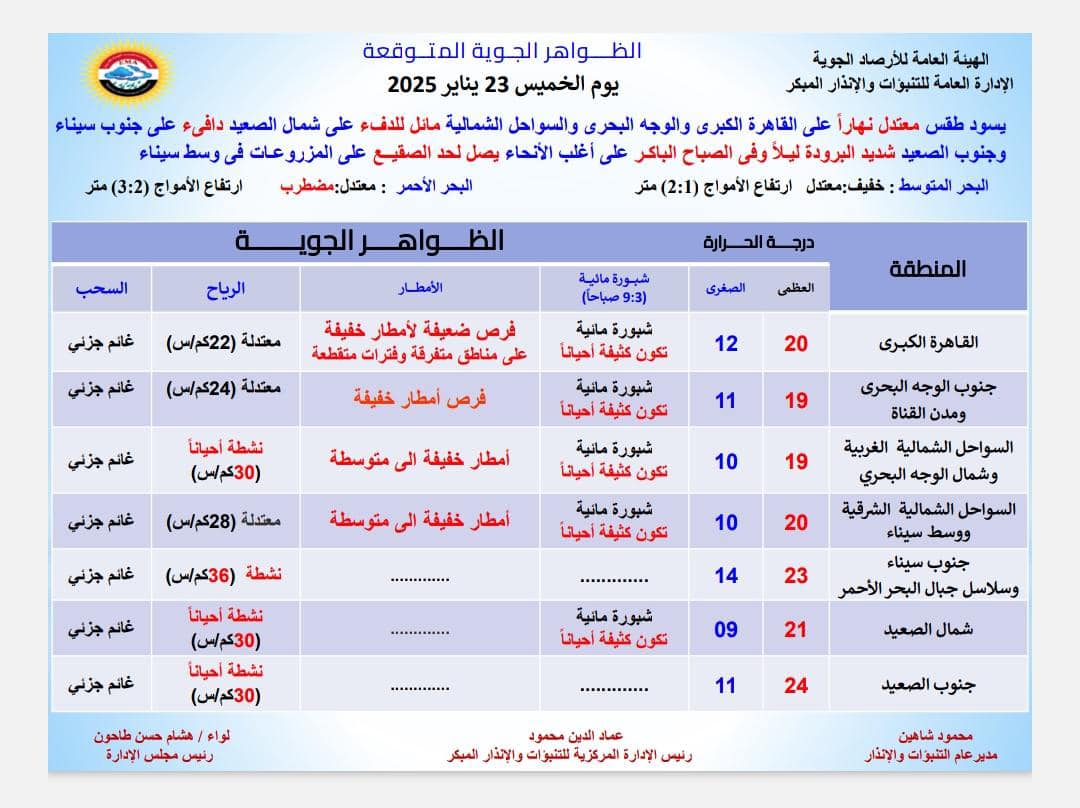 وأوضحت الأرصاد الجوية في بيانها التفصيلي، أن اليوم يسود طقس معتدل الحرارة نهارًا على القاهرة الكبرى والوجه البحري والسواحل الشمالية، مائل للدافئ على شمال الصعيد، دافئ على جنوب الصعيد وجنوب سيناء، شديد البرودة ليلًا وفي الصباح الباكر على أغلب الأنحاء يصل إلى حد الصقيع على المزروعات في وسط سيناء.