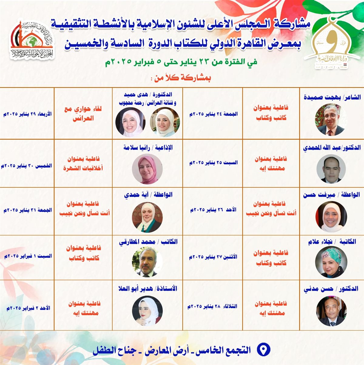 من جانبه يشارك المجلس الأعلى للشئون الإسلامية التابع لوزارة الأوقاف في الدورة الـ٥٦ لمعرض القاهرة الدولي للكتاب، الذي يُقام في الفترة من ٢٣ من يناير، حتى ٥ فبراير ٢٠٢٥م، من خلال تنظيم مجموعة من الأنشطة الثقافية، التي تهدف إلى نشر الثقافة الإسلامية وتعزيز الوعي العام بين الزوار.