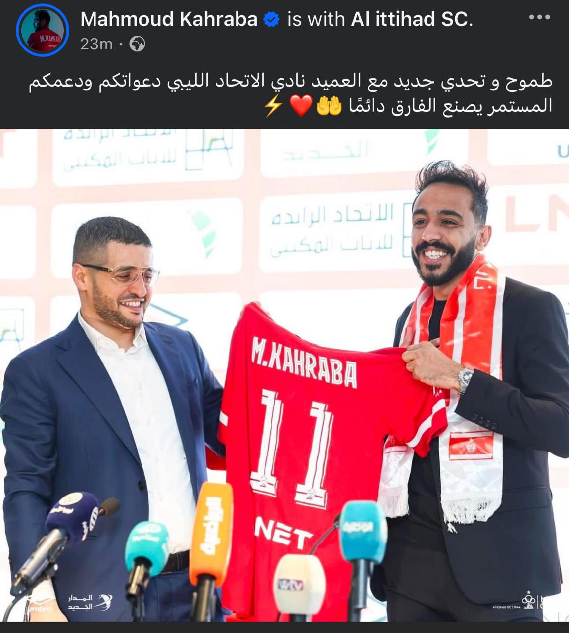 ونشر كهربا عبر حسابه الشخصي علي فيسبوك صورة من مؤتمر تقديمه لاعبا في صفوف الاتحاد الليبي معلقا: “طموح وتحدٍ جديد مع العميد نادي الاتحاد الليبي دعواتكم ودعمكم المستمر يصنع الفارق دائمًا ”.