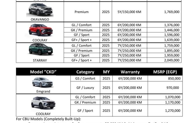 وأخطر الوكيل المحلي للعلامة التجارية جيلي كافة الموزعين والتجار باسعار موديلات 2025 المقرر العمل بها في جميع المعارض وهي كالتالي: