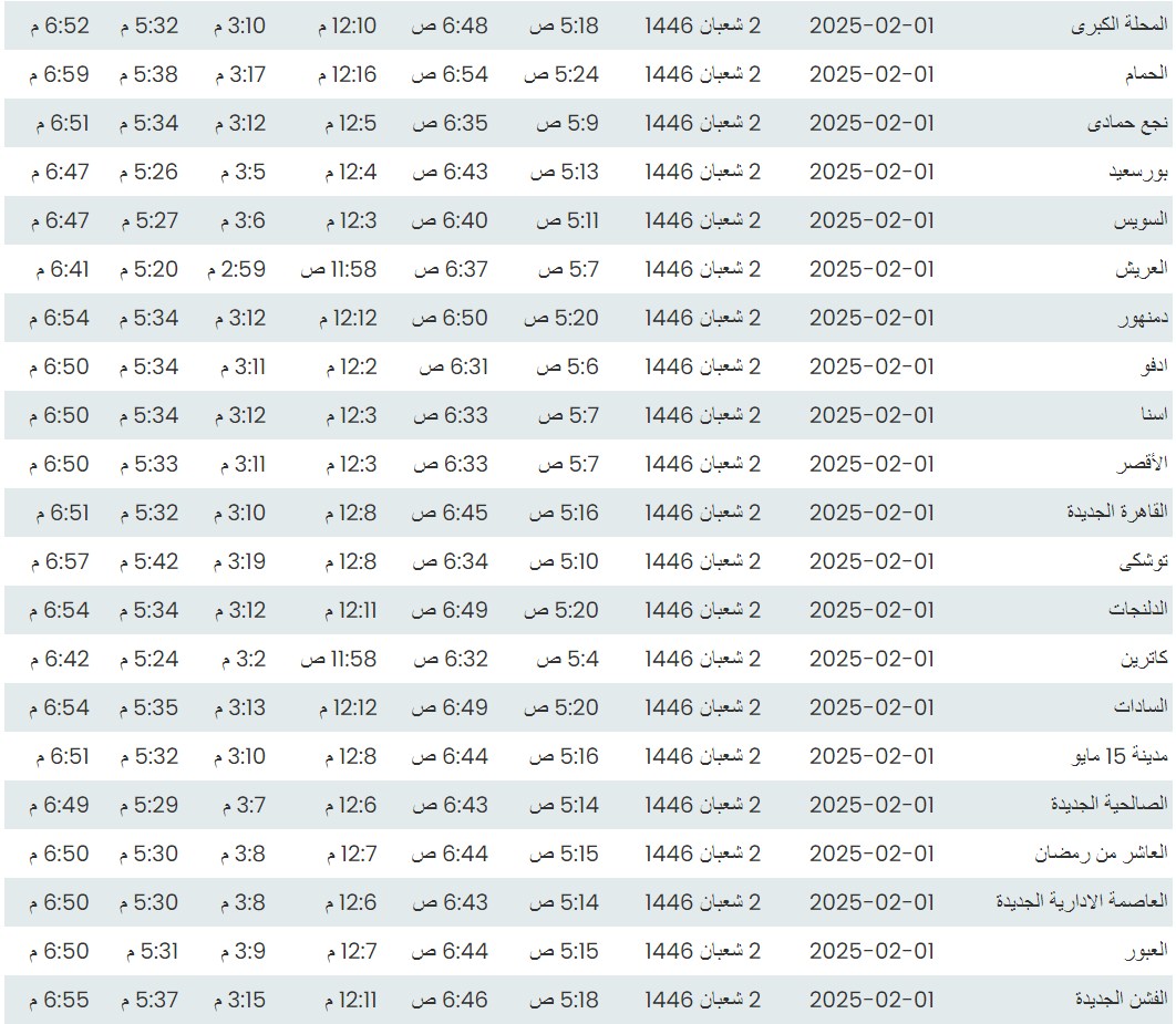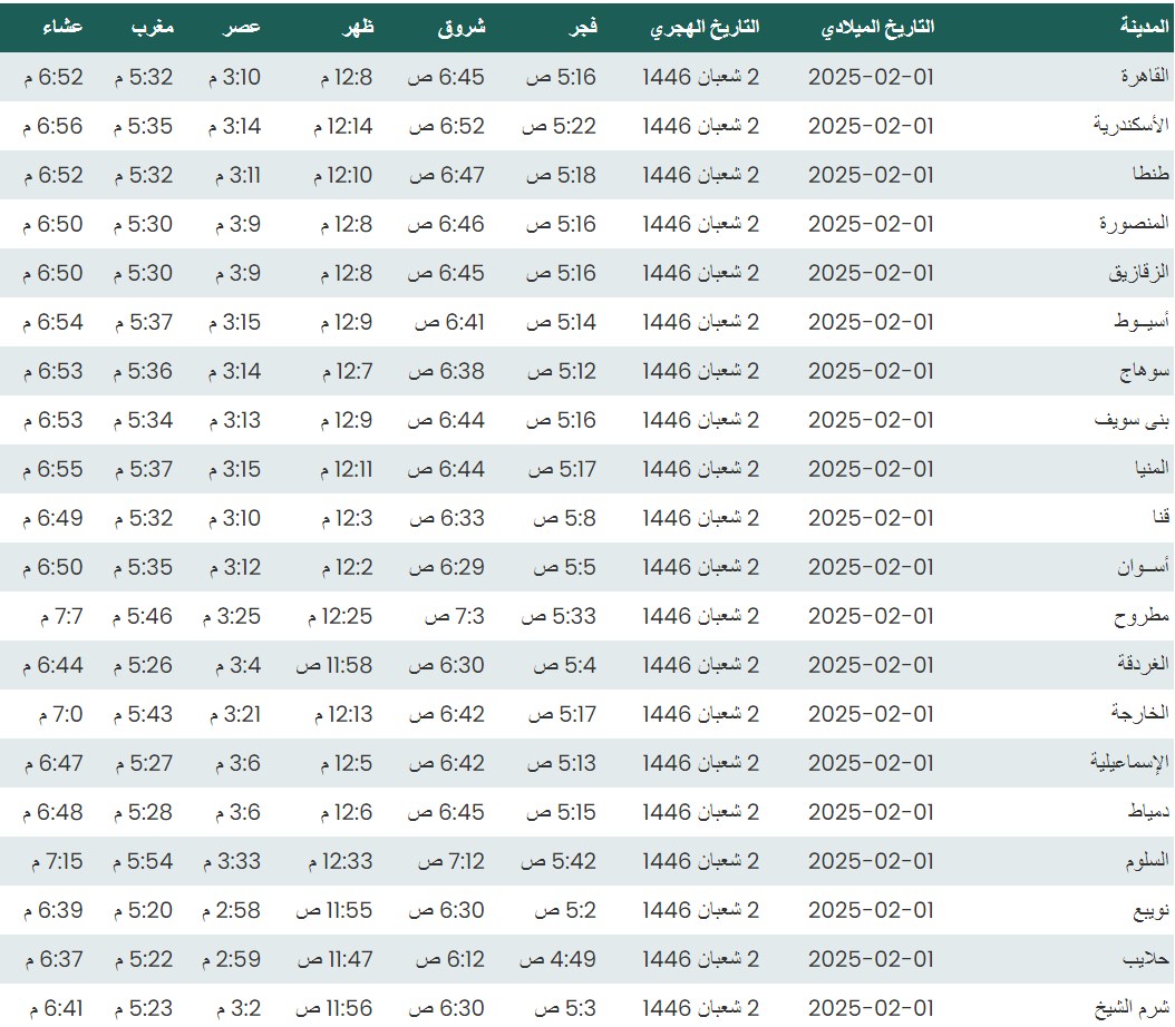 مواقيت الصلاة اليوم السبت 1 - 2- 2025 في القاهرة والمحافظات