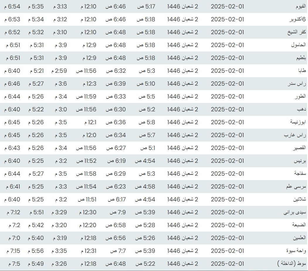 مواقيت الصلاة اليوم وفقًا للتوقيت المحلي لمدينتي القاهرة والإسكندرية وكذلك، مواقيت الصلاة، لعدد من مدن ومحافظات الجمهورية من واقع بيانات الهيئة العامة للمساحة