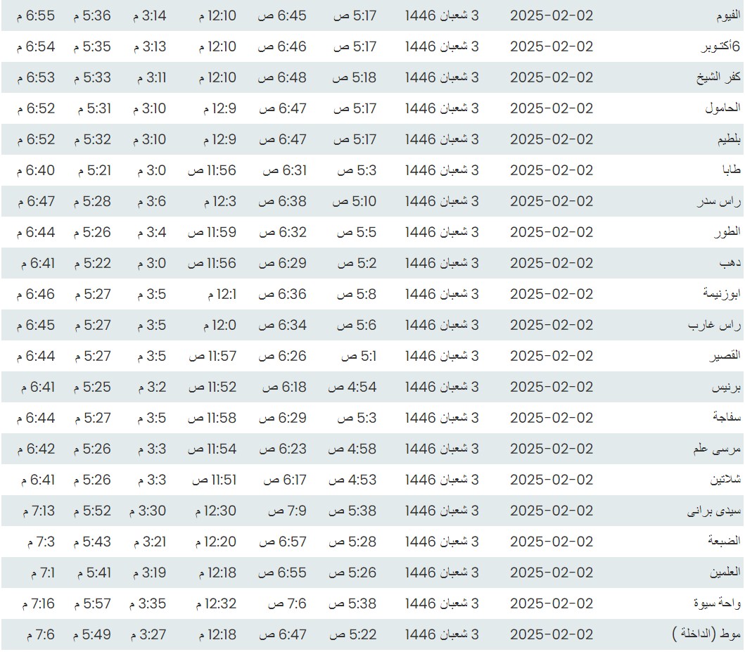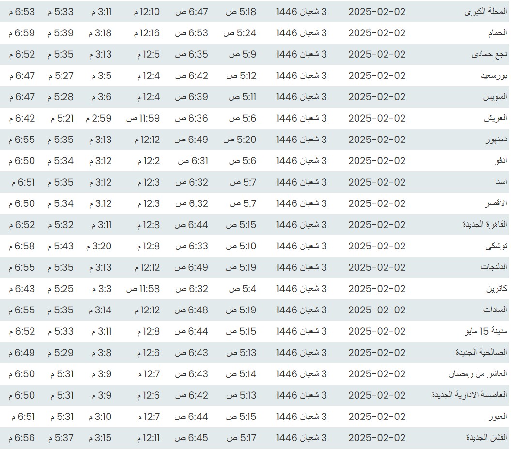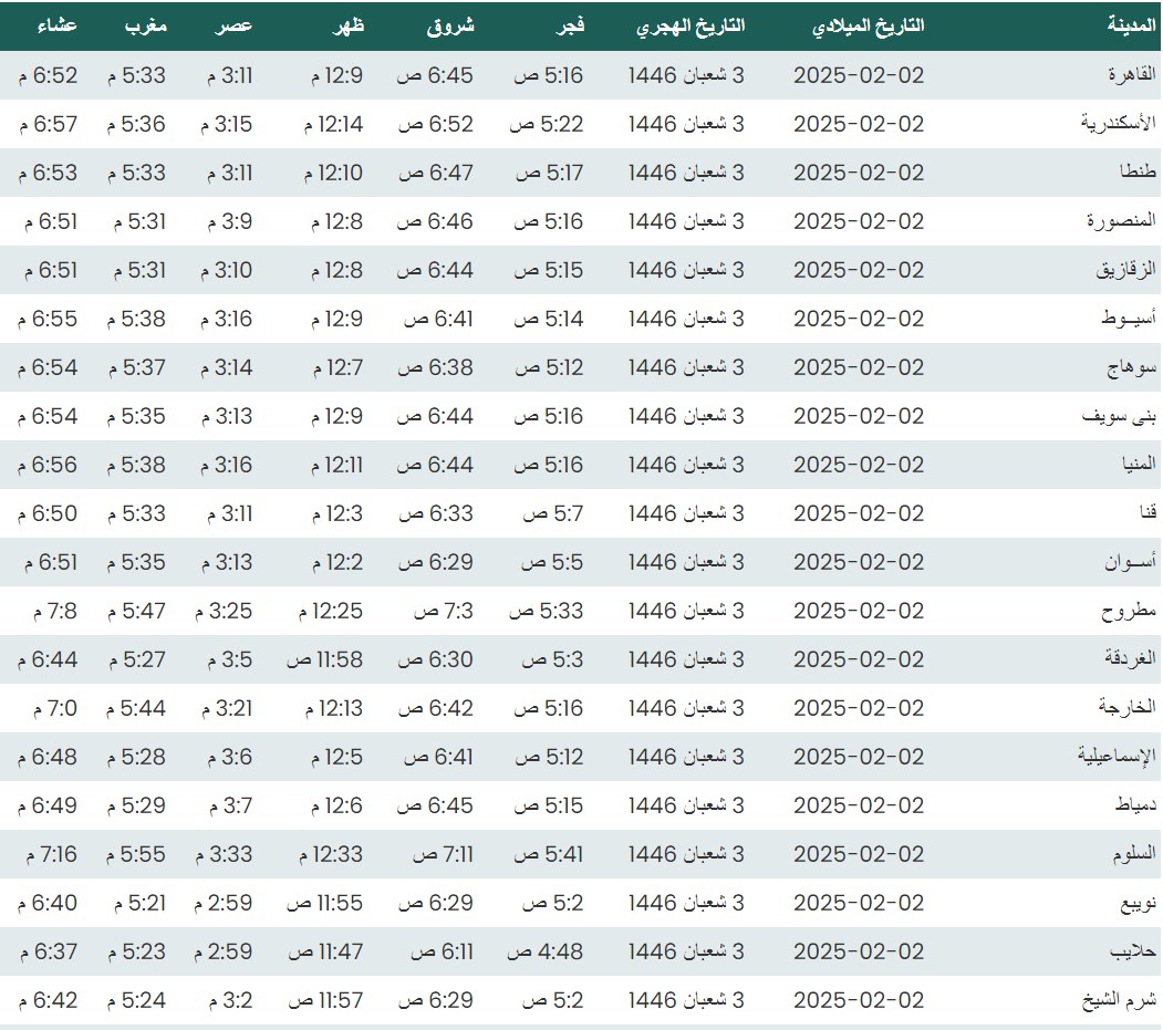 وفيما يلي مواقيت الصلاة، لعدد من مدن ومحافظات الجمهورية من واقع بيانات الهيئة العامة للمساحة