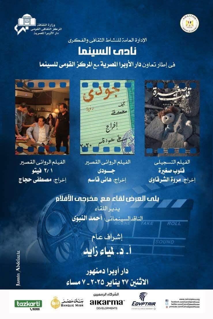 تعرض دار الأوبرا المصرية برئاسة الدكتورة لمياء زايد، فيلمين روائيين قصيرين، وذلك ضمن نشاطها الثقافي والفكري، في نادى سينما أوبرا دمنهور، بالتعاون مع المركز القومي للسينما.
